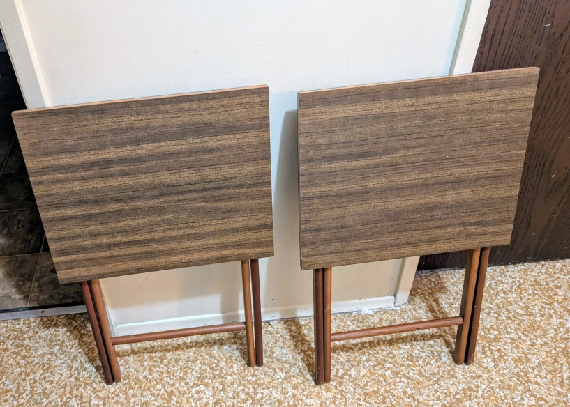Selling a set of two Scheibe folding TV tray tables. These vintage tables feature a wood grain top and wooden legs. They're perfect for snacks, meals, or activities in front of the TV!