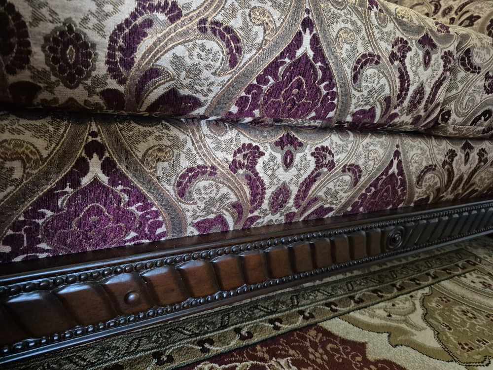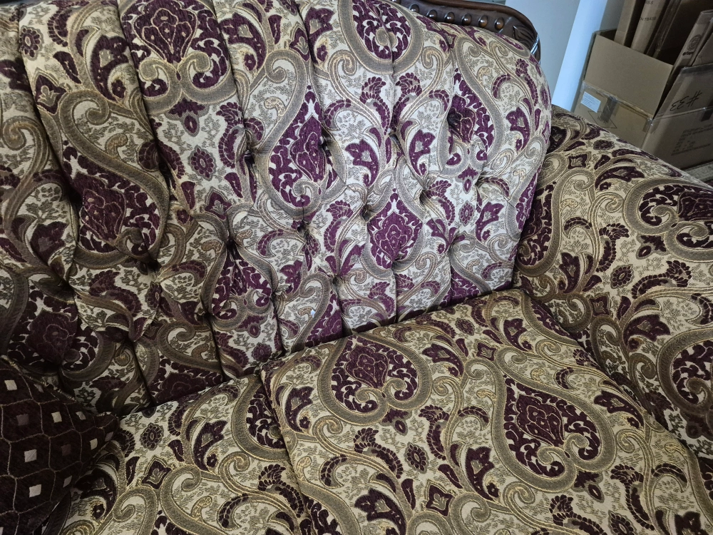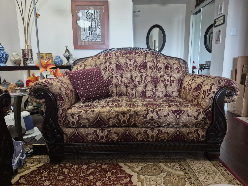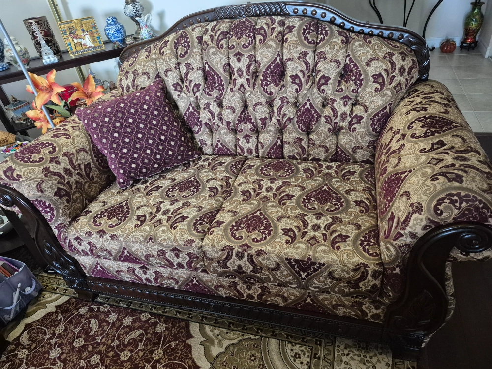Selling a loveseat and sofa with a unique patterned design! It features a beautiful combination of burgundy, beige, and brown tones. The loveseat and sofa are in excellent condition and would be a great addition to any living room or seating area.