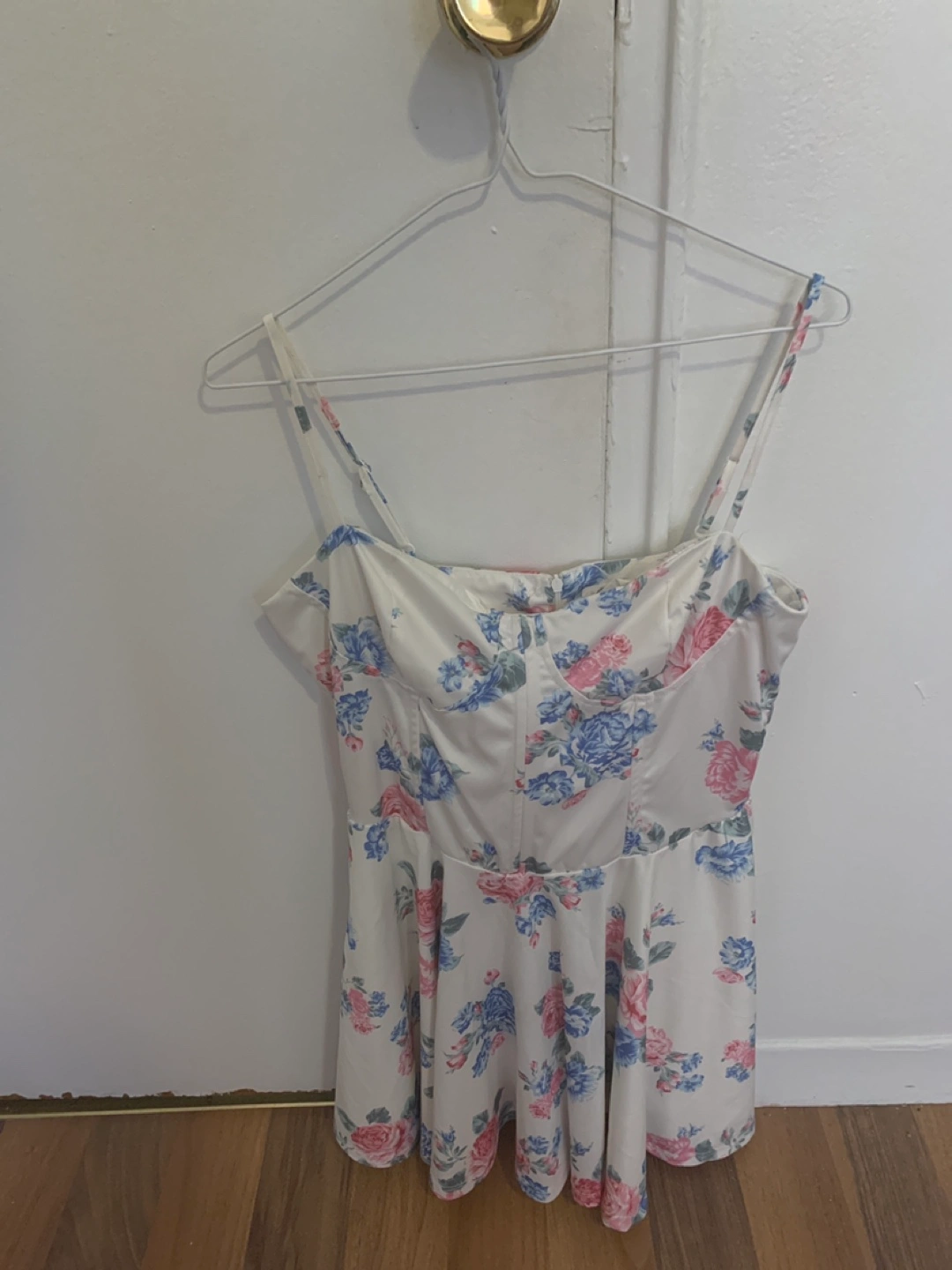 A floral Ardene dress in a large size, lightly worn, no marks or tears on the dress will wash before pickup. Dress has a corset like top.