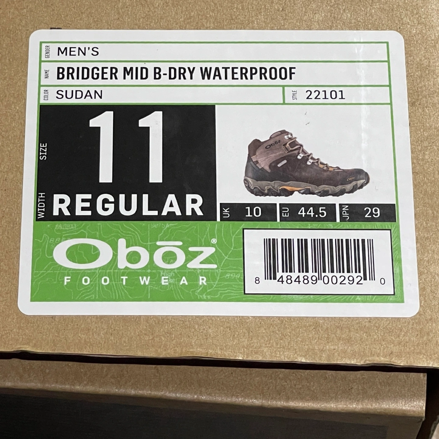 Selling a pair of Oboz Bridger Mid B-Dry Waterproof boots in men's size 11. The colour is Sudan. These are regular width. They come in the original box. These boots feature O Fit insoles for superior fit and comfort. Price is negotiable.