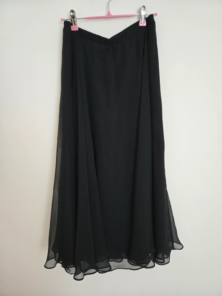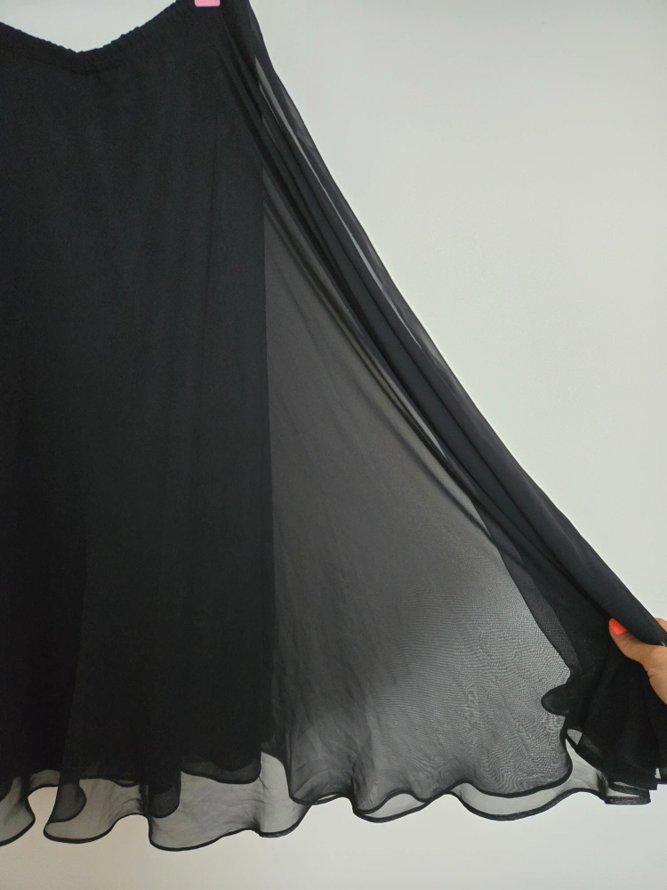 Black chiffon skirt. It's in great condition and would be a wonderful addition to any wardrobe! The material is lightweight and flowy, perfect for warmer weather or layering. Quality material. Lining under chiffon skirt
