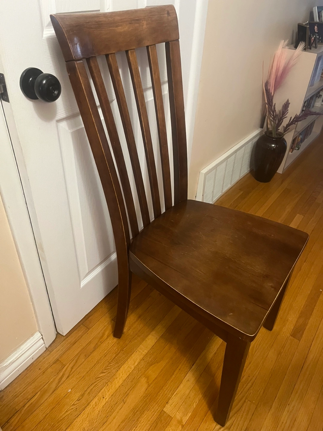 A classic solid wooden dining chair in a brown finish. It's sturdy and ready to add a touch of warmth to your dining space. The chair shows some signs of use but is still in good condition. Glendale SW area
