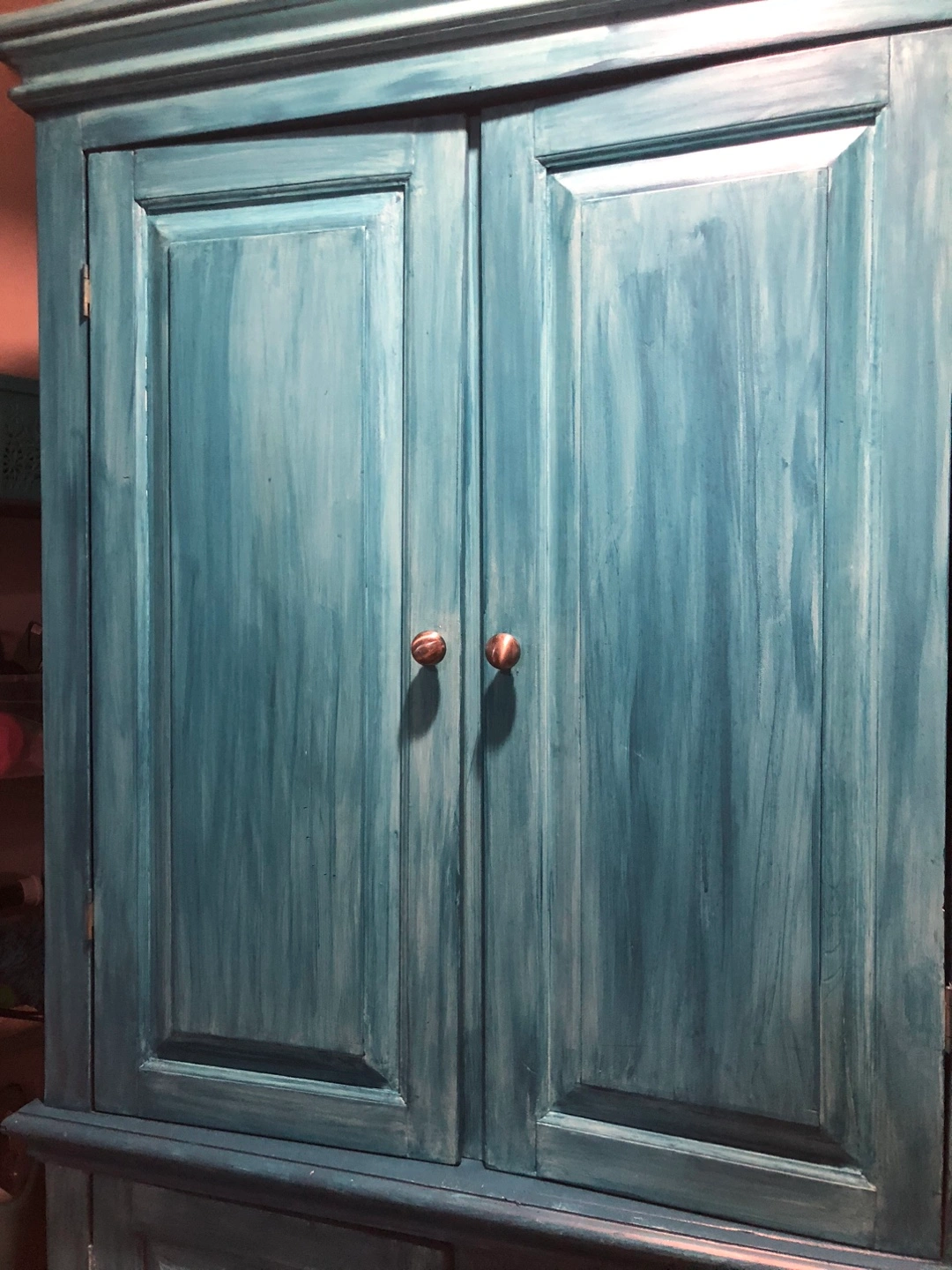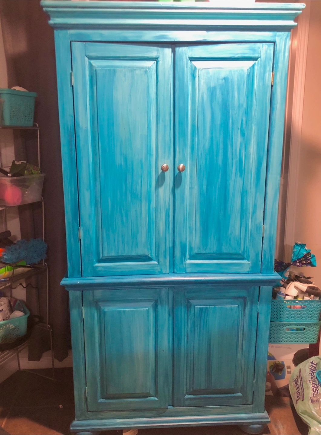 Here's a charming refinished vintage turquoise cabinet, perfect for adding a pop of colour and extra storage to any room! It features both a shelved upper section and a lower section with drawers, so there's plenty of space to organize your belongings. It's in good used condition and ready for a new home