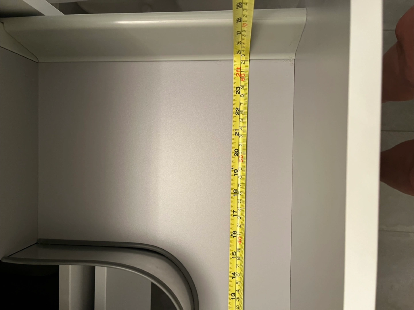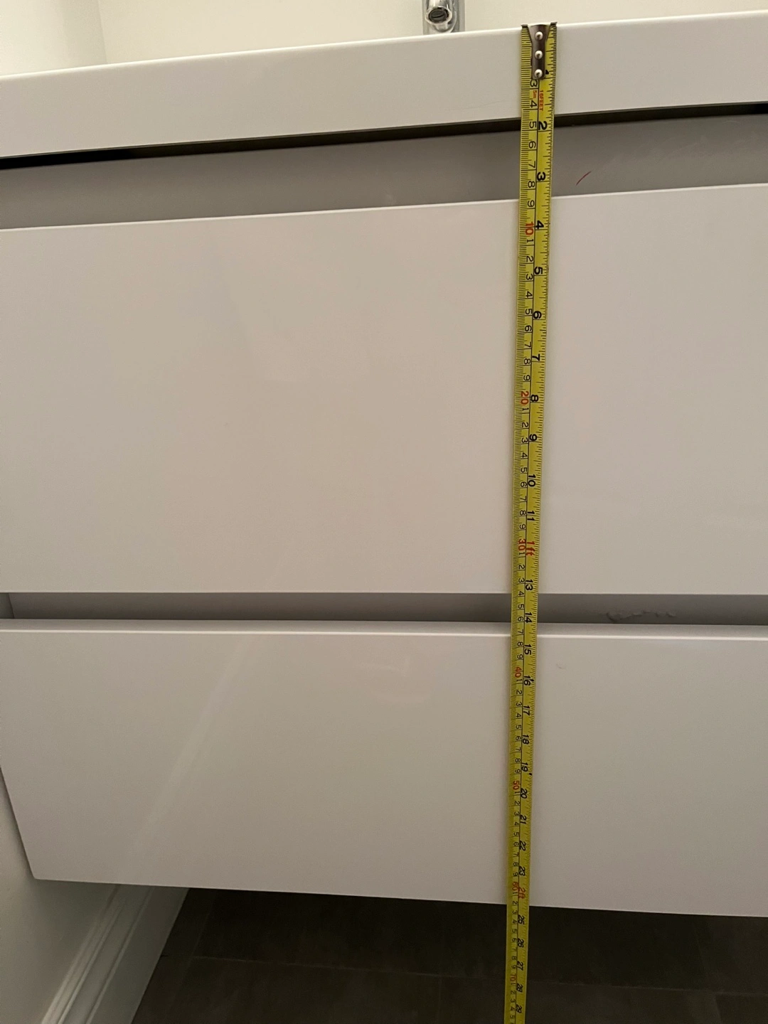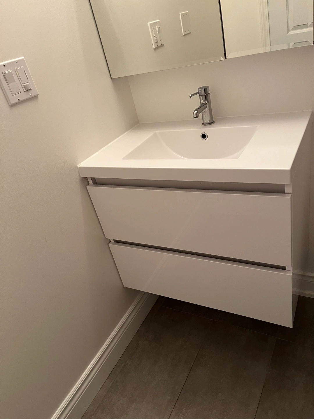 Modern white floating bathroom vanity with sink and faucet. It features two large drawers for storage. Perfect for a bathroom renovation or upgrade!