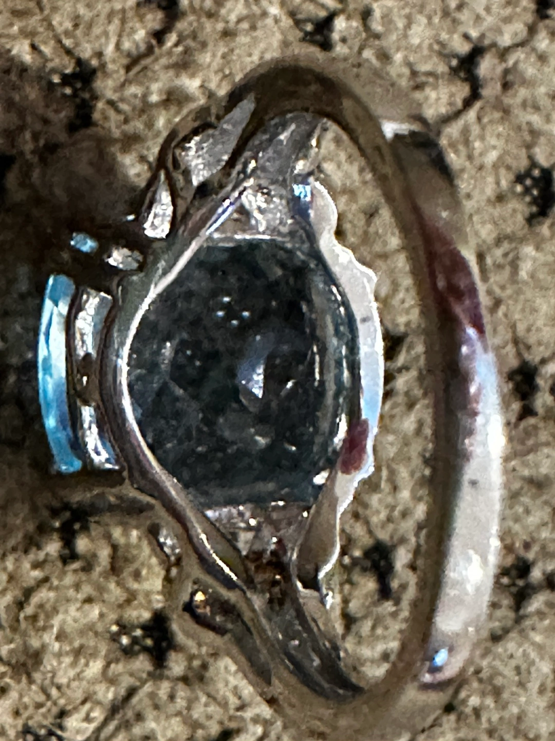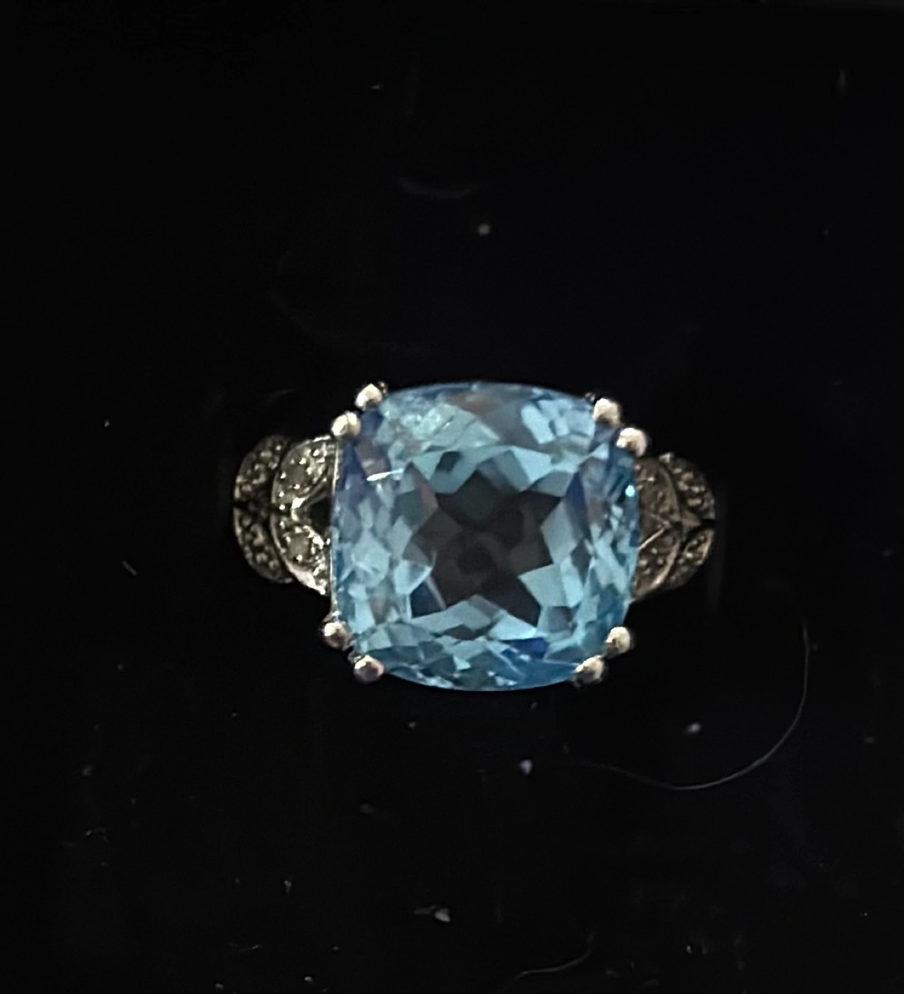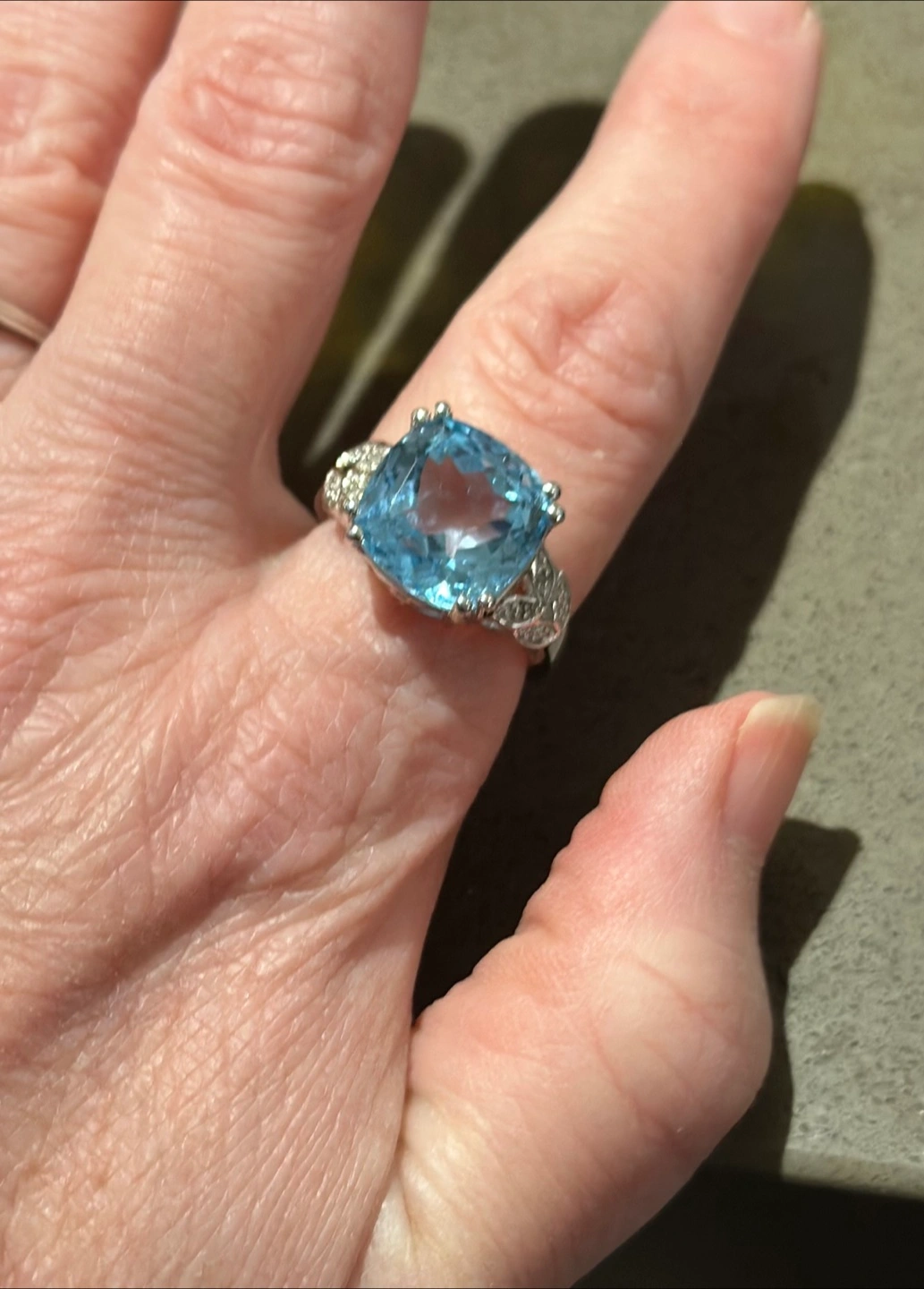 153This gorgeous ring showcases a stunning, vibrant blue topaz gemstone, beautifully set in a lovely sterling silver design. The intricate details add an elegant touch and a cheerful splash of color to any outfit! - **8.100 CTW** - **Cushion Cut** - **Sterling Silver marked 925** with Rhodium Plating (prevents tarnish) - **Size:** 7 - **Bonus:** Adorable teeny diamond accents (but the star here is definitely the topaz!) I happily accept cash payments only, and just a quick note: I can't hold items. Thank you for understanding! Feel free to reach out if you have any questions—I'm here to help!