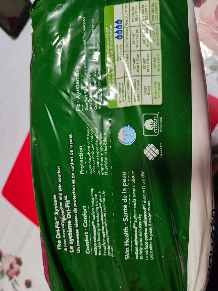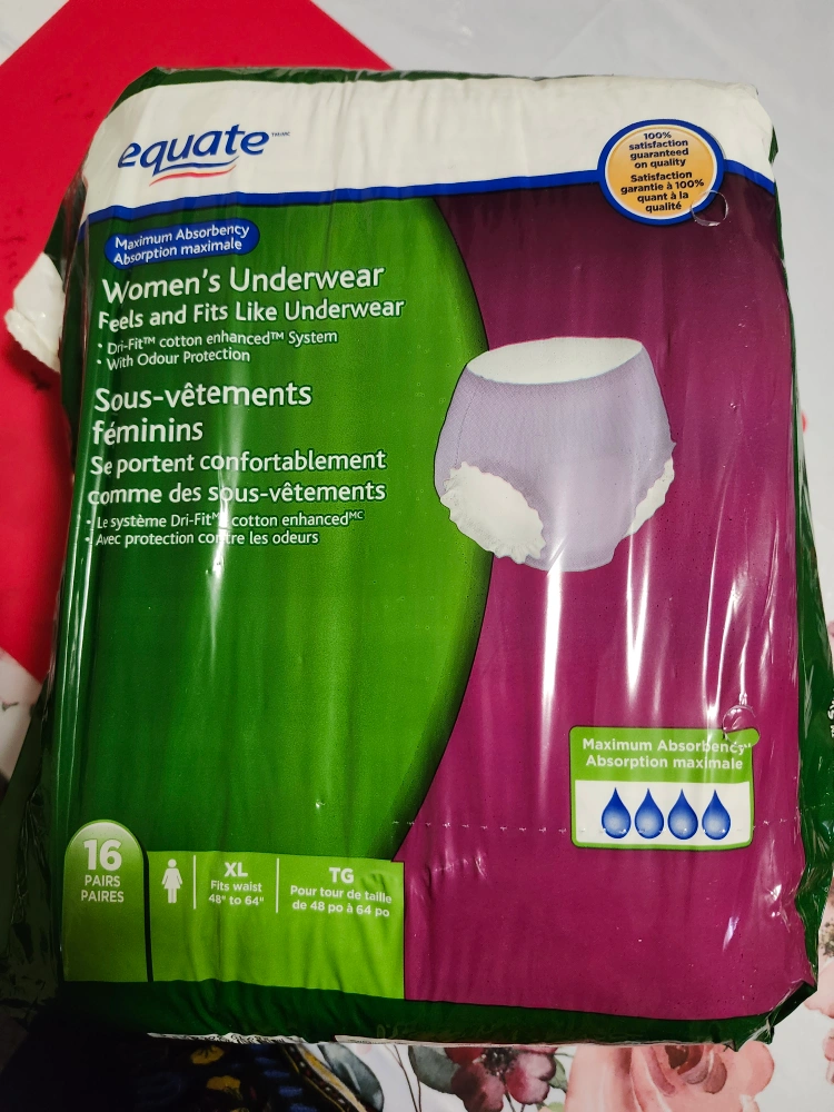 Selling a pack of Equate Women's Underwear in size XL. The pack contains 16 pairs. These offer maximum absorbency and feel and fit like underwear. They feature the Dri-Fit cotton enhanced system and odour protection. package not open. please serious buyers only. thanks!!