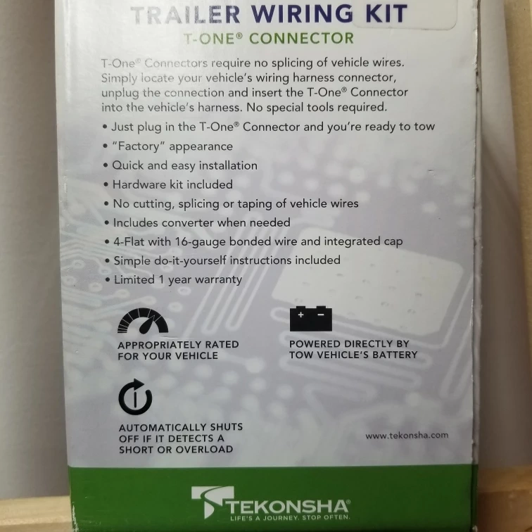Selling a Tekonsha T-One Connector trailer wiring kit, model 118592. This kit is designed for 2013-Current Lexus ES 350 and ES 300h models. It requires no splicing of vehicle wires and offers a quick and easy installation. The kit includes hardware and a converter when needed, featuring a 4-Flat with 16-gauge bonded wire and integrated cap. Also includes simple do-it-yourself instructions