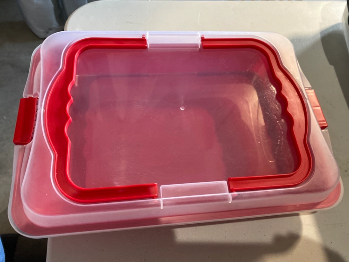 111Selling a handy plastic storage container! It features a clear body with red accents on the handles and latches. Great for organizing your stuff around the house or for seasonal storage