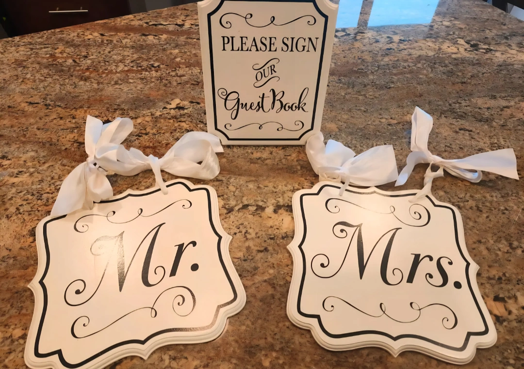 Set of wedding signs including Mr. and Mrs. signs with ribbons and a 'Please Sign Our Guest Book' sign. Perfect for adding a touch of elegance to your special day!