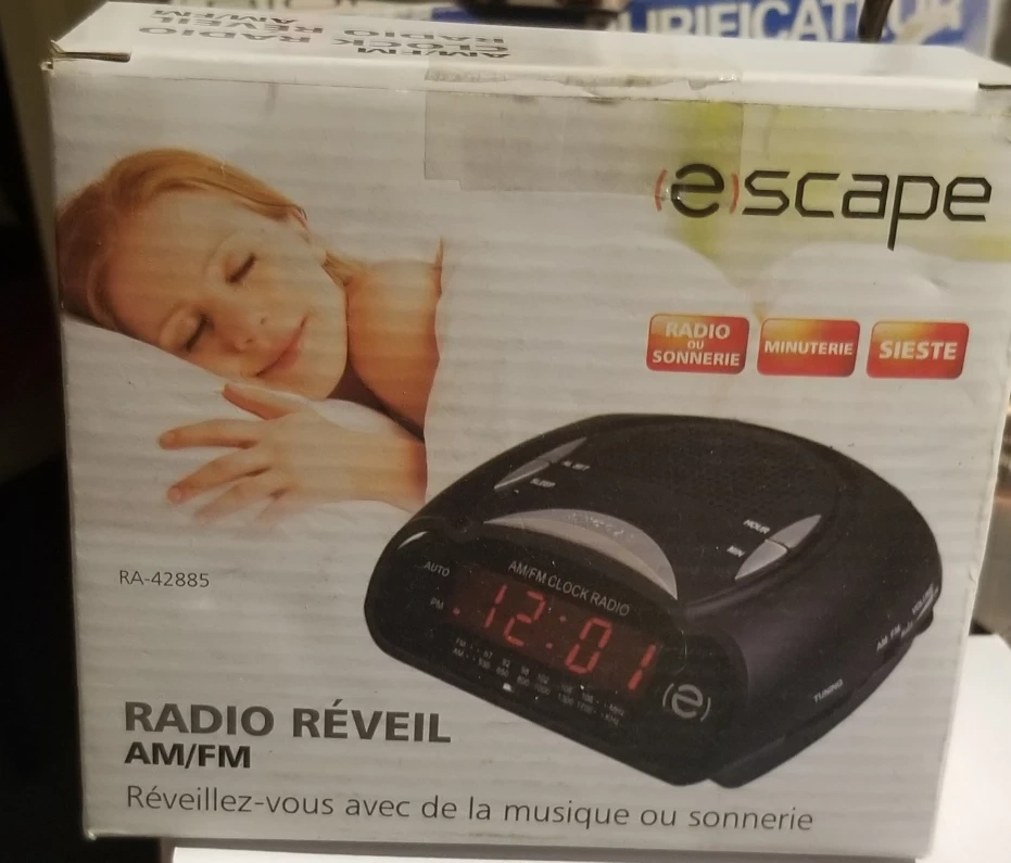 Selling a brand new Escape AM/FM Clock Radio, still in its original packaging! It features a sleep timer and snooze function, perfect for waking up to music or an alarm. It also has a battery back-up power for the clock and a built-in antenna. I have 2 of them