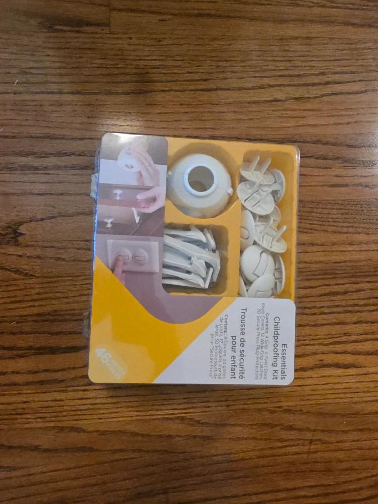 Selling a Safety 1st Essentials Childproofing Kit! It includes 4 Grip 'n Twist Door Knob Covers, 12 Wide Grip Latches, and 30 Secure Press Plug Protectors. This kit has everything you need to keep your little one safe and sound.
