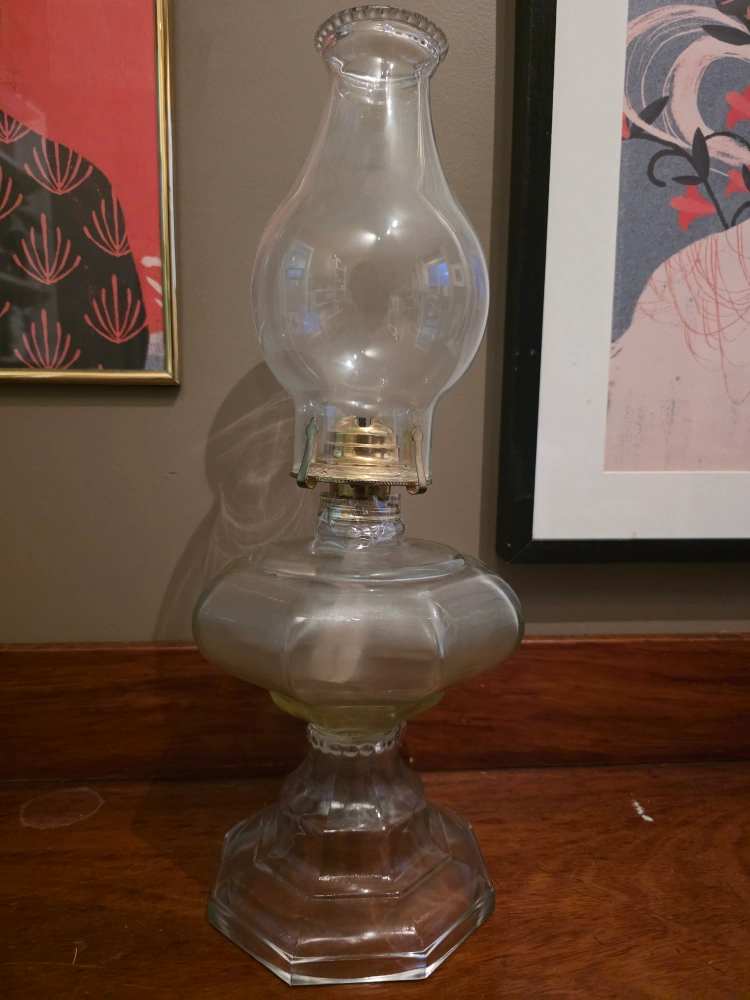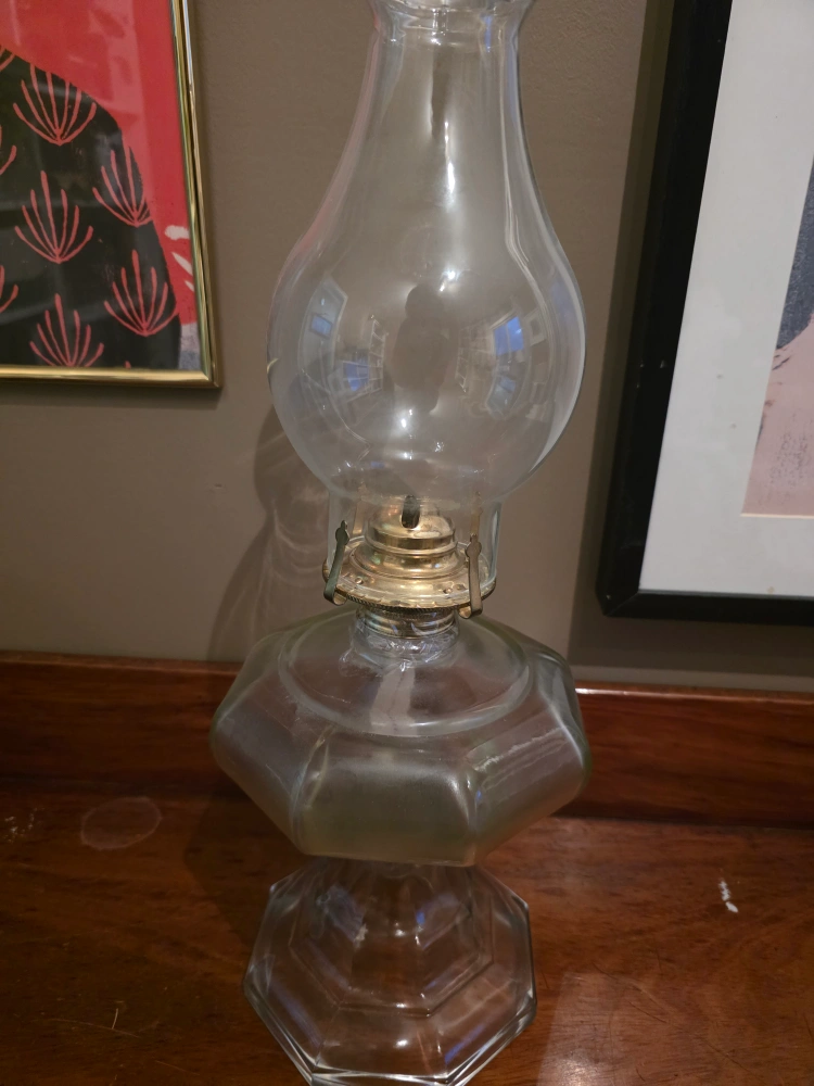 Selling a vintage glass oil lamp. It's in good condition and would make a lovely addition to any room. It has a classic design and is perfect for creating a cozy atmosphere