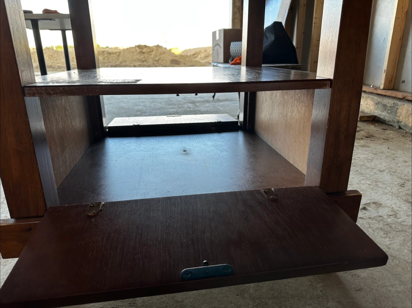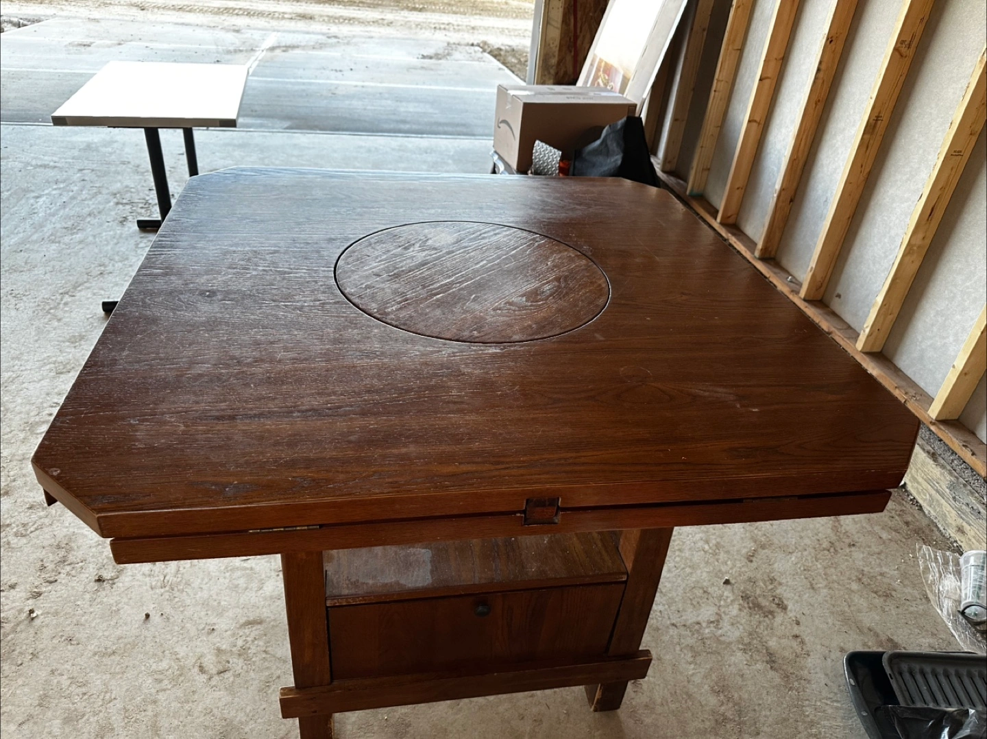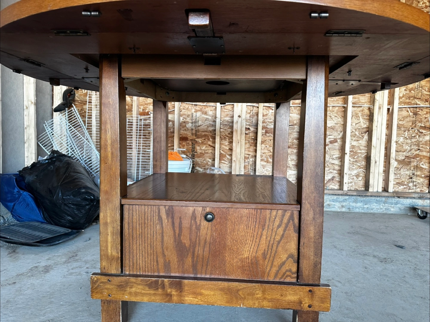 Here's a sturdy wooden dining table with a unique round design! It features a convenient storage compartment underneath, perfect for keeping things organized. The table has a rich, dark wood finish that would complement any dining space. It's in good condition and ready for a new home!