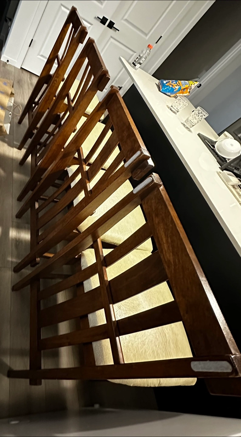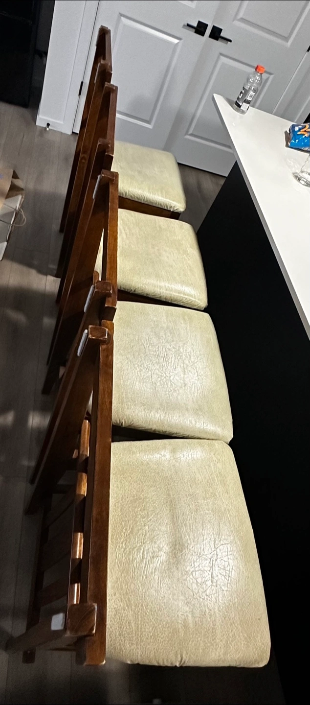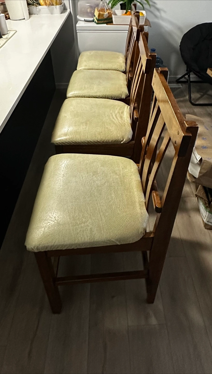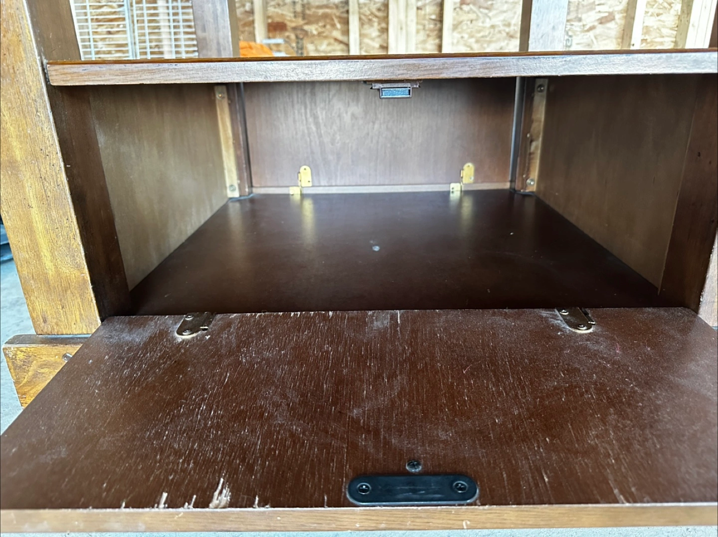 Here's a sturdy wooden dining table with a unique round design! It features a convenient storage compartment underneath, perfect for keeping things organized. The table has a rich, dark wood finish that would complement any dining space. It's in good condition and ready for a new home!