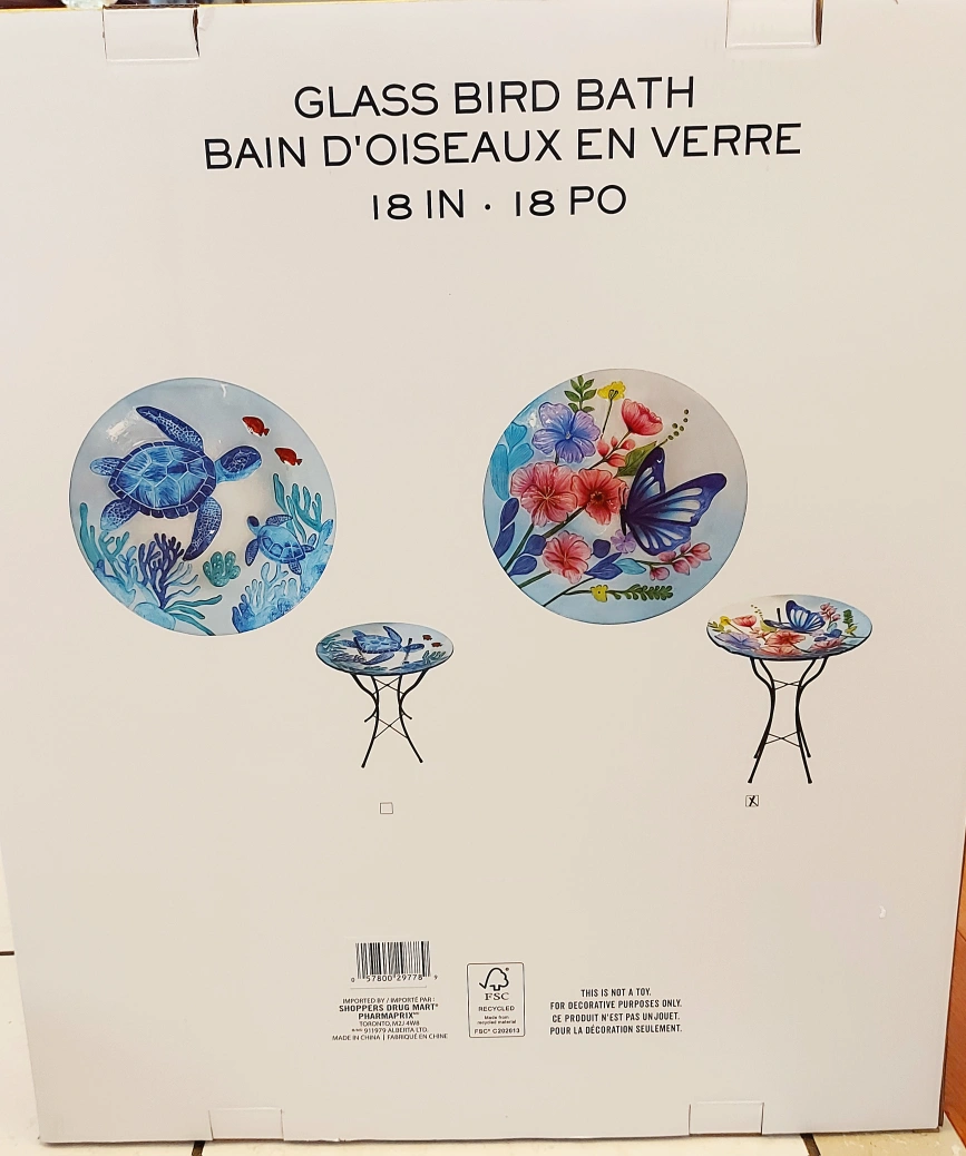It features a colorful design with a prominent butterfly and floral patterns, crafted from glass.