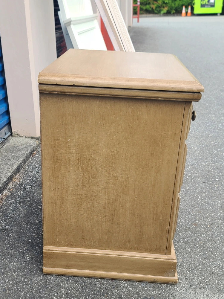 Here's a wooden nightstand with three drawers. It has a neutral colour and classic design. It's perfect for adding some extra storage to your bedroom. Delivery can be arranged. viewing and pickup by appointment.