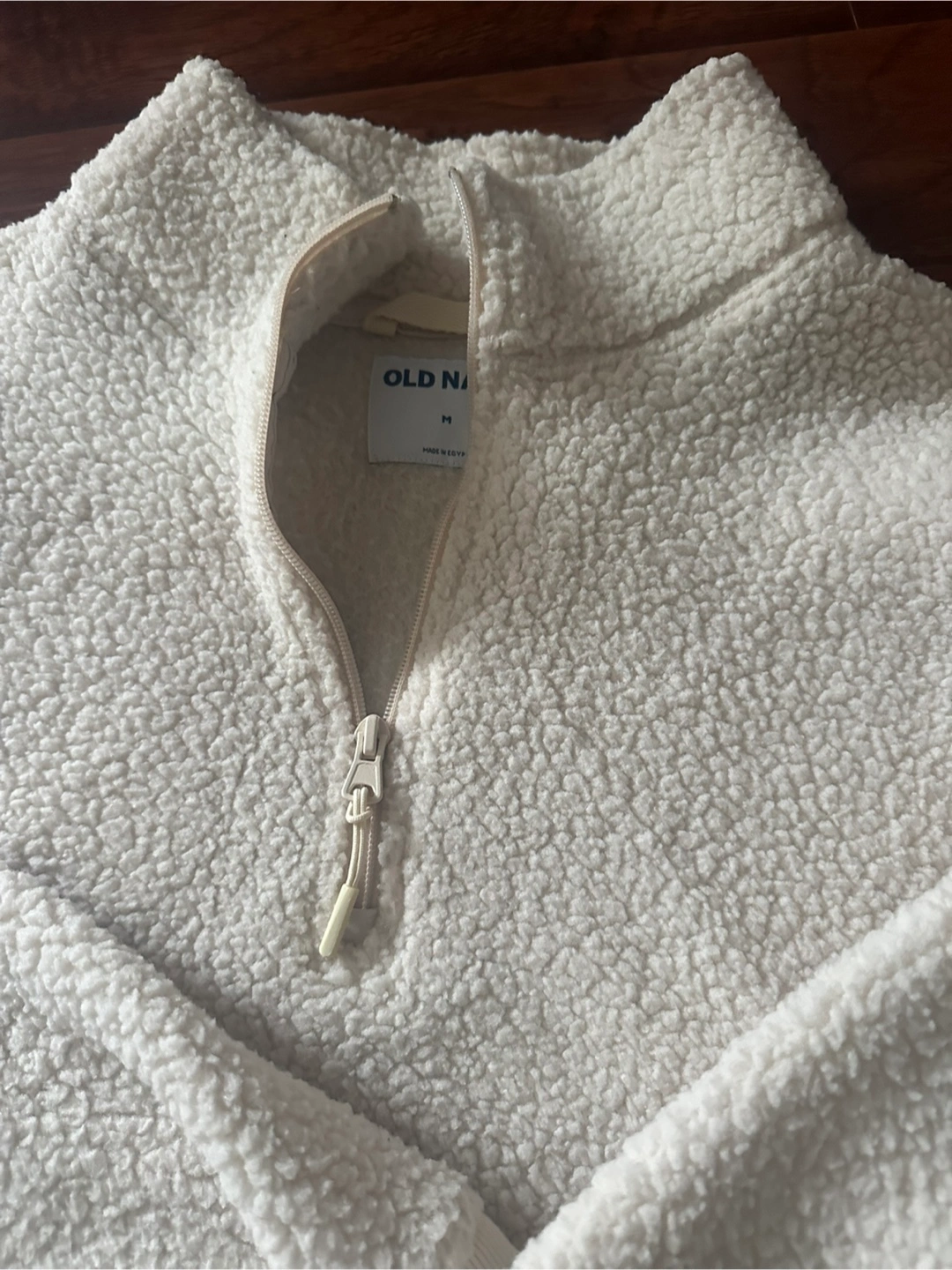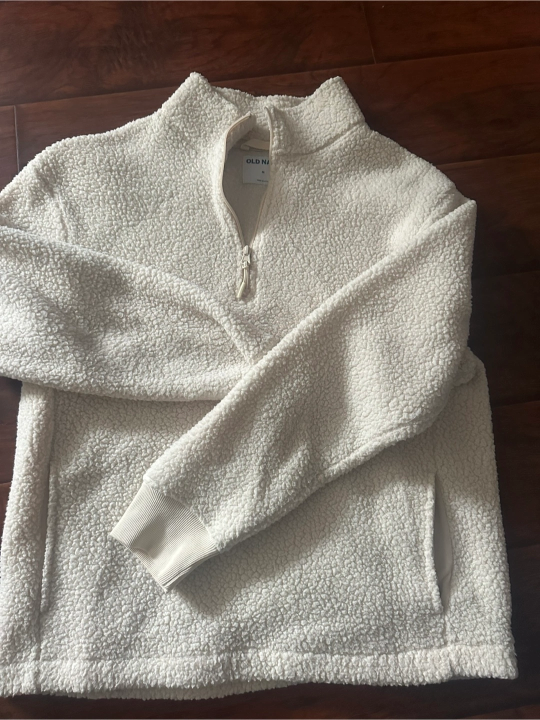 Selling a cozy Old Navy sherpa pullover in a cream colour! It's a size medium and features a quarter-zip design. Perfect for staying warm and comfy on chilly days