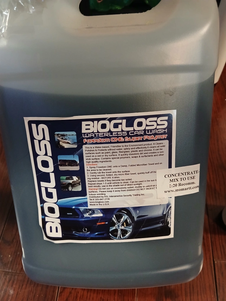 Biogloss Waterless Car Wash Freedom ONE Super Polymer. It's a water-based, environmentally friendly product that cleans, polishes, and protects without water. It effectively cleans all solid surfaces such as paint, glass, fiberglass, plastic, and chrome. It quickly dissolves dirt and creates a non-slick surface. Contains special polymers, soaps, surfactants, and other high-quality ingredients