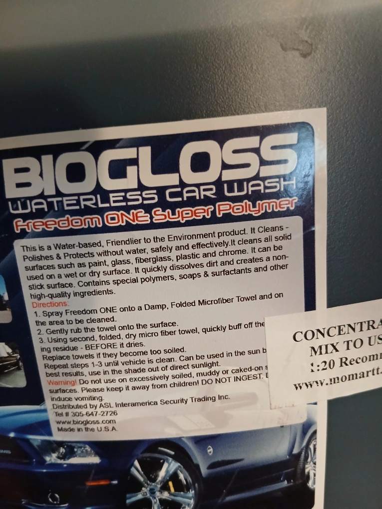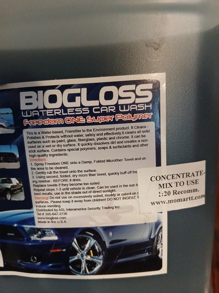 Biogloss Waterless Car Wash Freedom ONE Super Polymer. It's a water-based, environmentally friendly product that cleans, polishes, and protects without water. It effectively cleans all solid surfaces such as paint, glass, fiberglass, plastic, and chrome. It quickly dissolves dirt and creates a non-slick surface. Contains special polymers, soaps, surfactants, and other high-quality ingredients