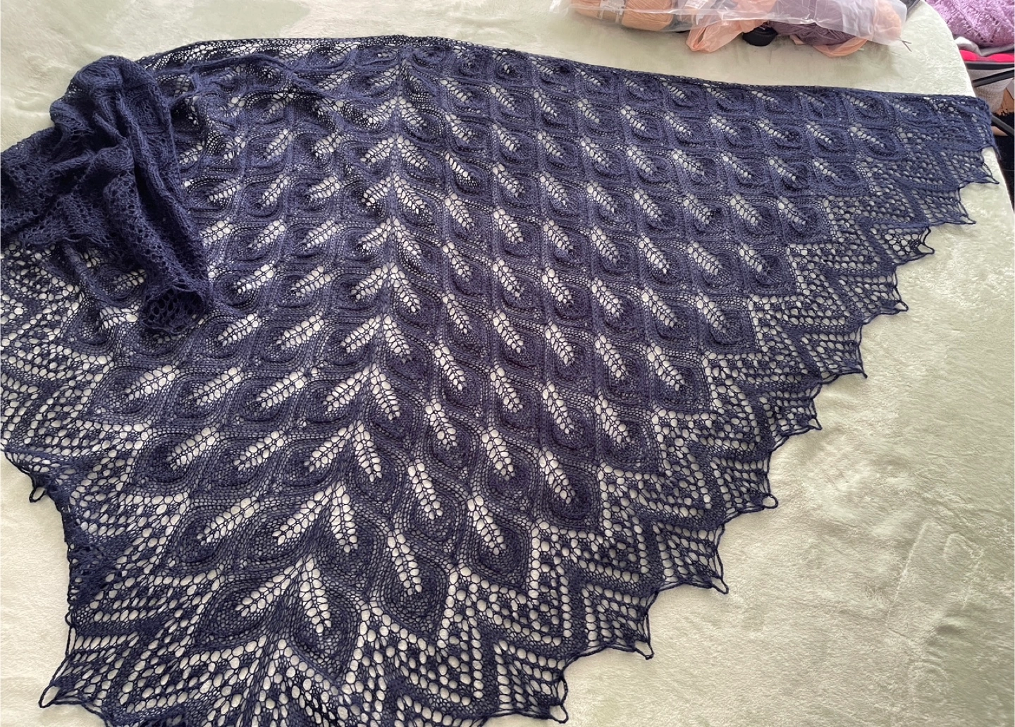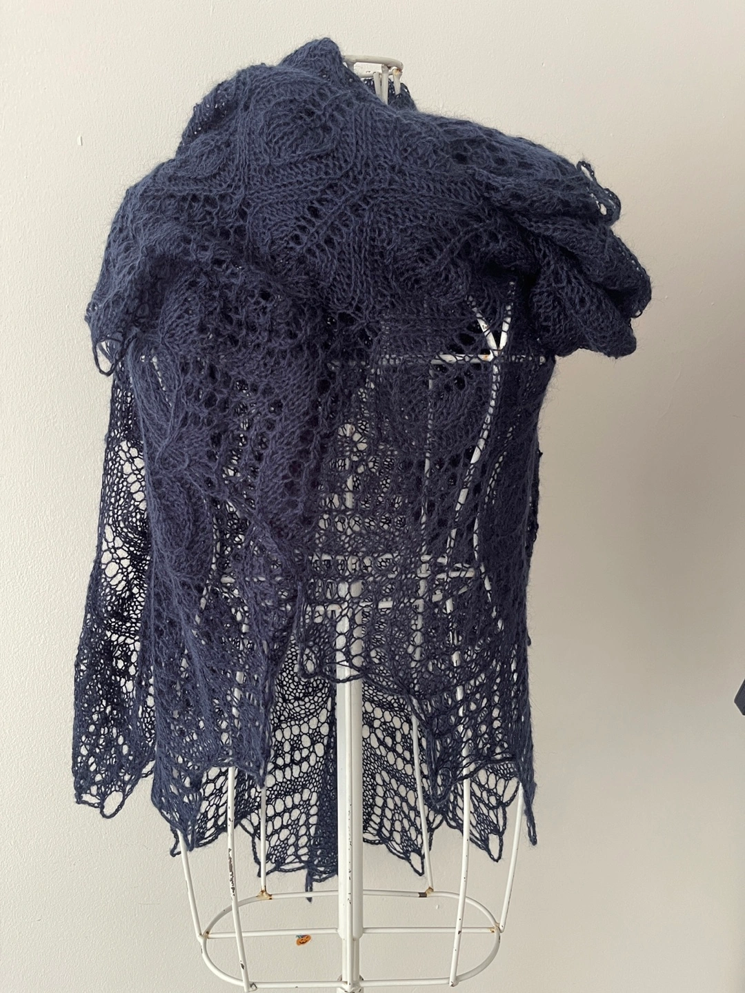 Beautiful hand-knitted lace shawl in a lovely navy blue colour! It's in great condition and ready to add a touch of elegance to your wardrobe. The intricate lace pattern is just stunning. Size 290 cm by 150 cm