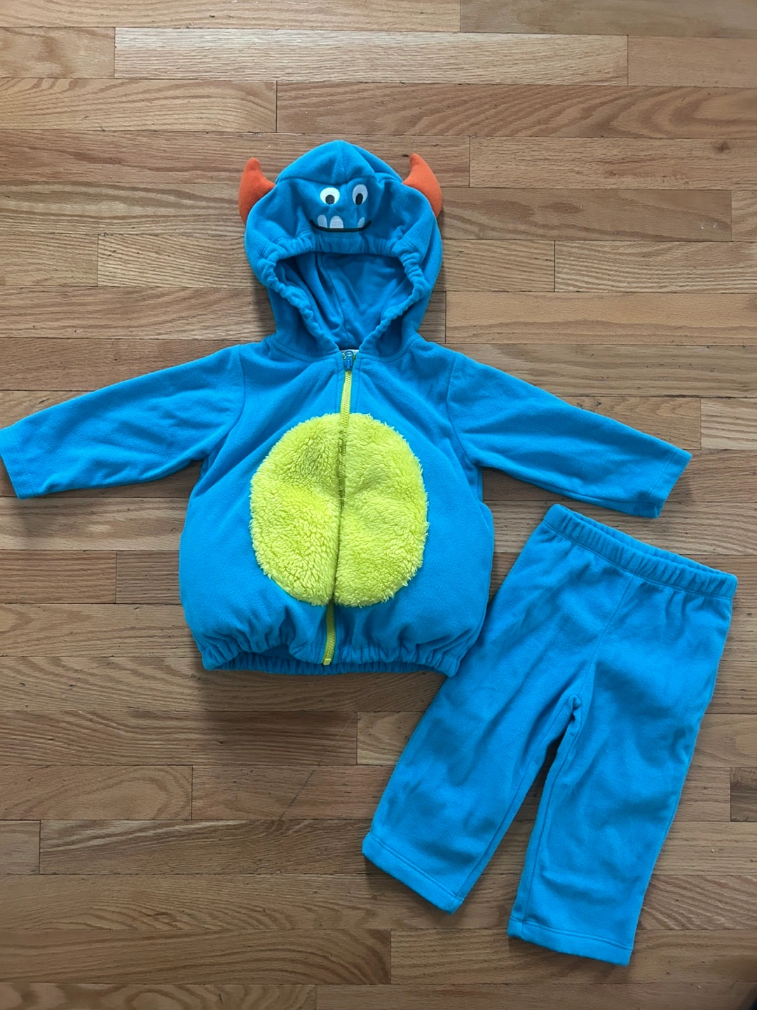 A cute and cozy monster costume for your little one! It's a bright blue colour with a fun monster face on the hood and a fluffy yellow belly. Size 18 months. Perfect for Halloween or dress-up play!
