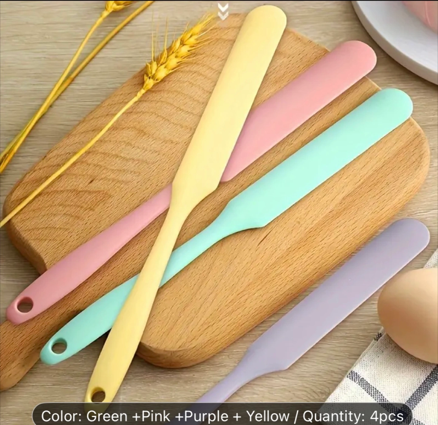 Get ready to upgrade your baking game with this set of four silicone spatulas! This set includes spatulas in green, pink, purple, and yellow. Each spatula measures about 24cm or 9.5 inches, making them perfect for various kitchen tasks. They're great for spreading, smoothing, and all your baking needs