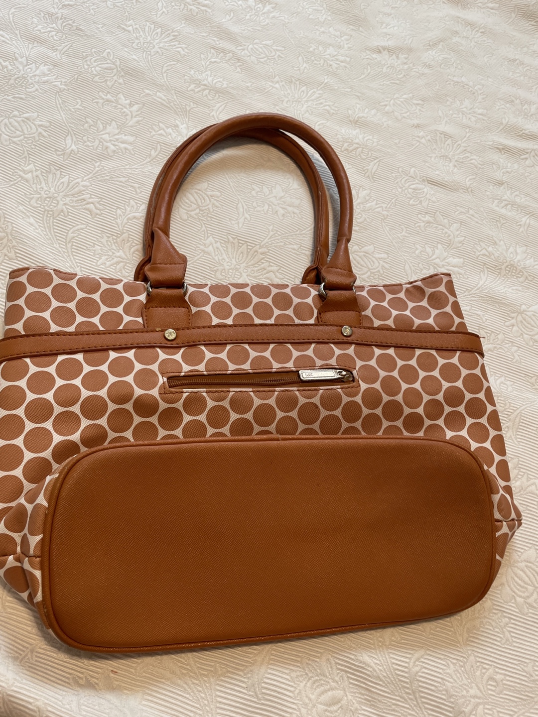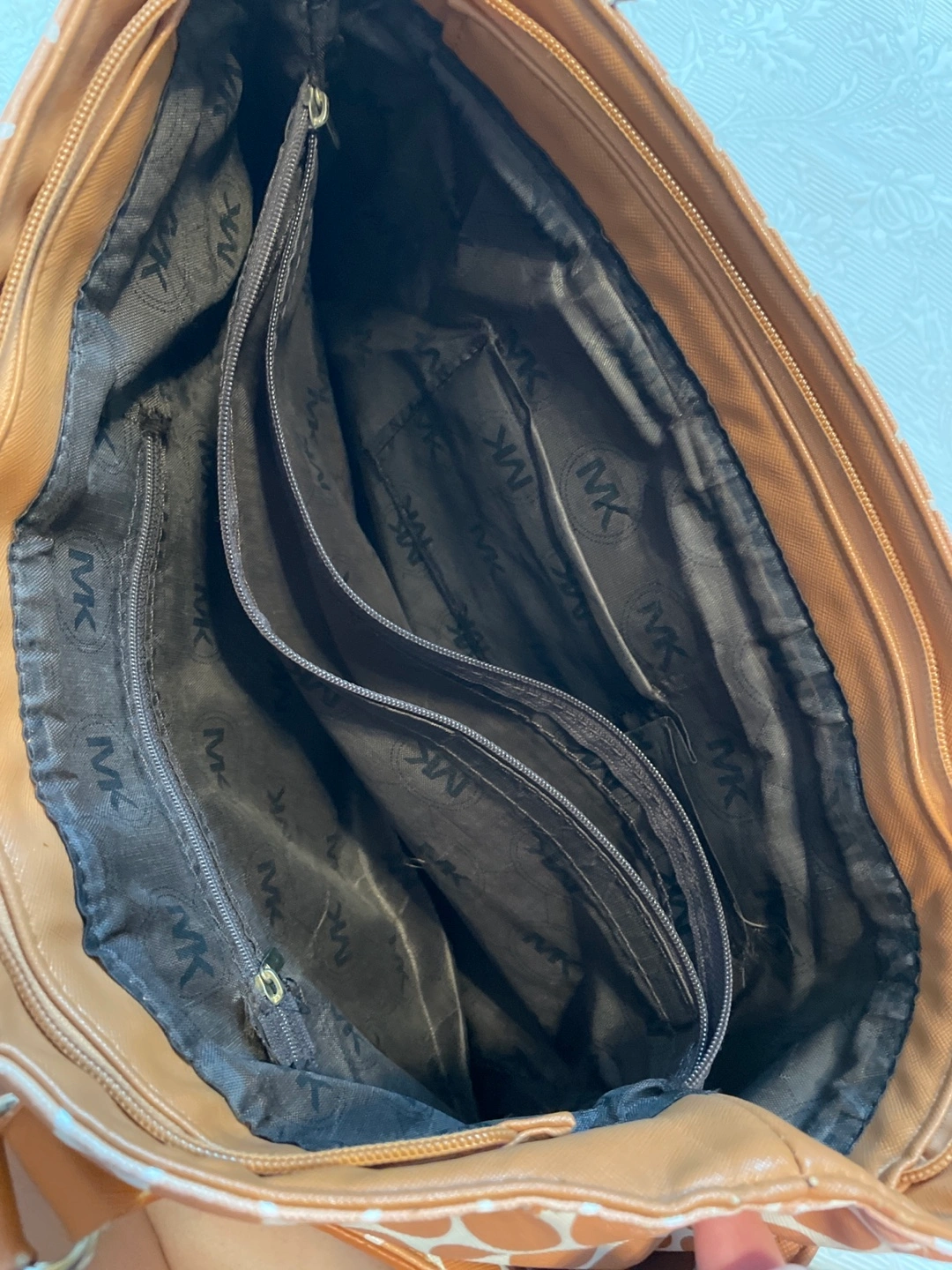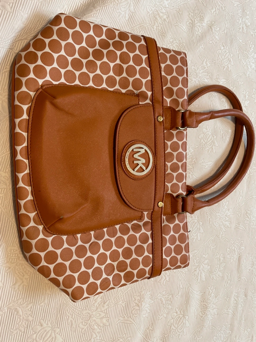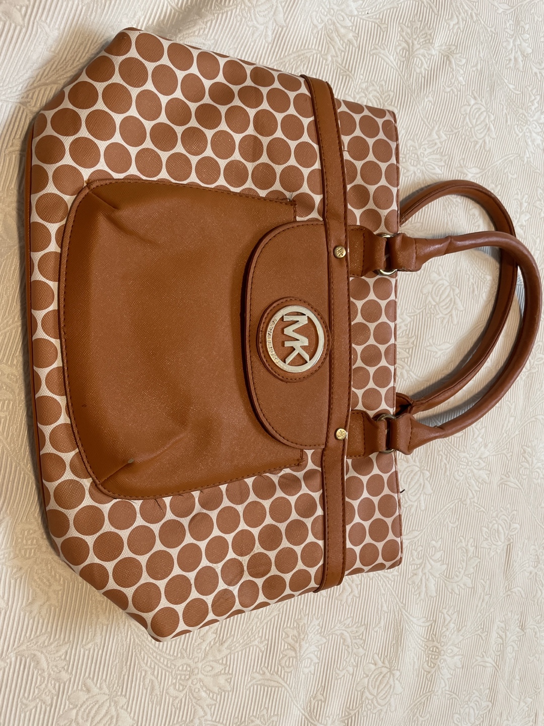 Gently used Michael Kors tote bag with a fun polka dot pattern! It's in great shape and ready for a new home. The bag features a brown exterior with white polka dots and brown handles. The interior has multiple compartments to keep your belongings organized