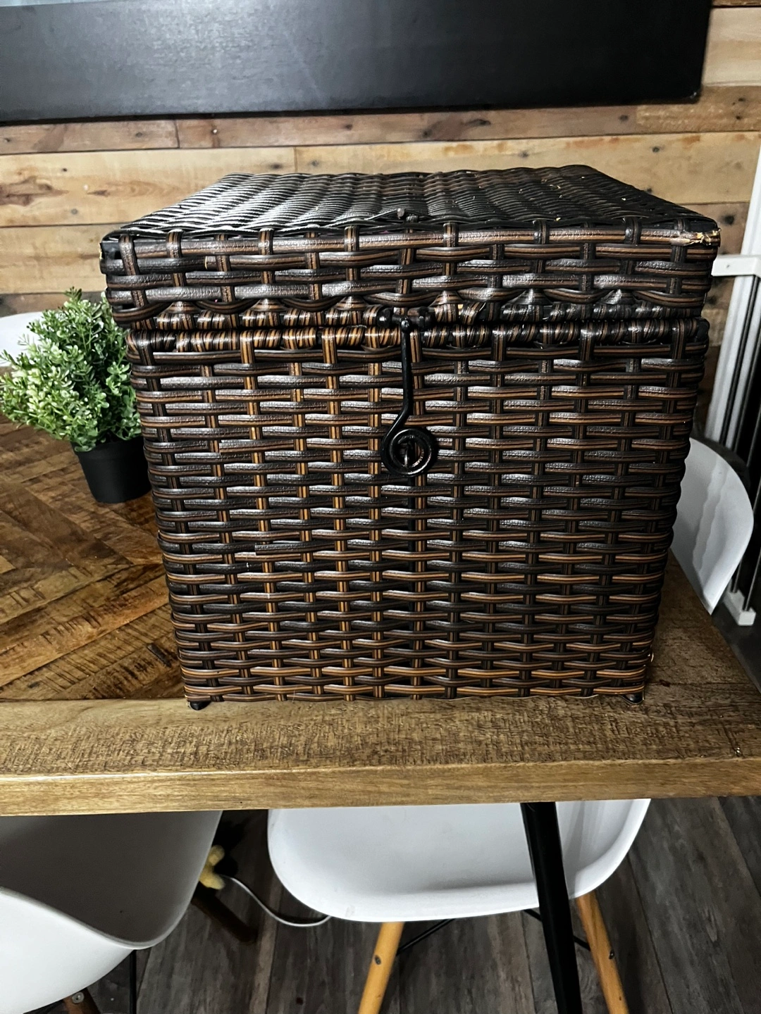 Selling a wicker like storage box. It's in good condition, perfect for storing blankets, toys, or anything else you need to keep organized. There is some wear and tear on one of the corners as shown in the photos.