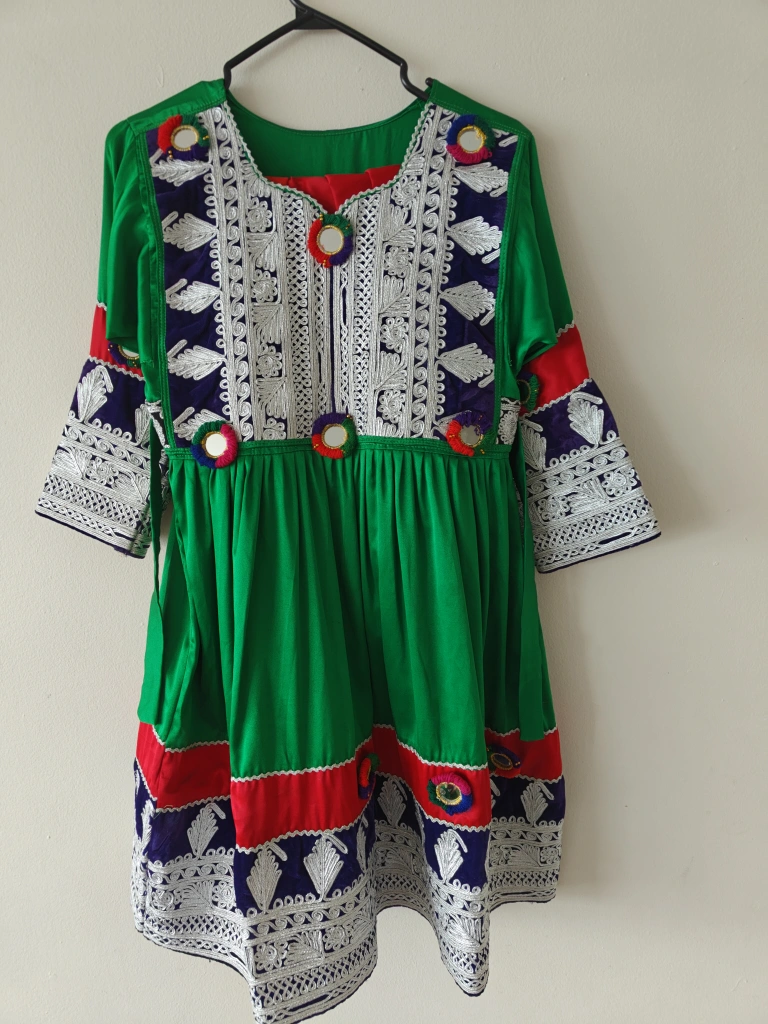 Beautiful green dress and red pants, a traditional outfit from Afghanistan. The dress has intricate embroidery and mirror details. The pants are a matching red colour. Perfect for cultural events or adding a unique piece to your wardrobe!