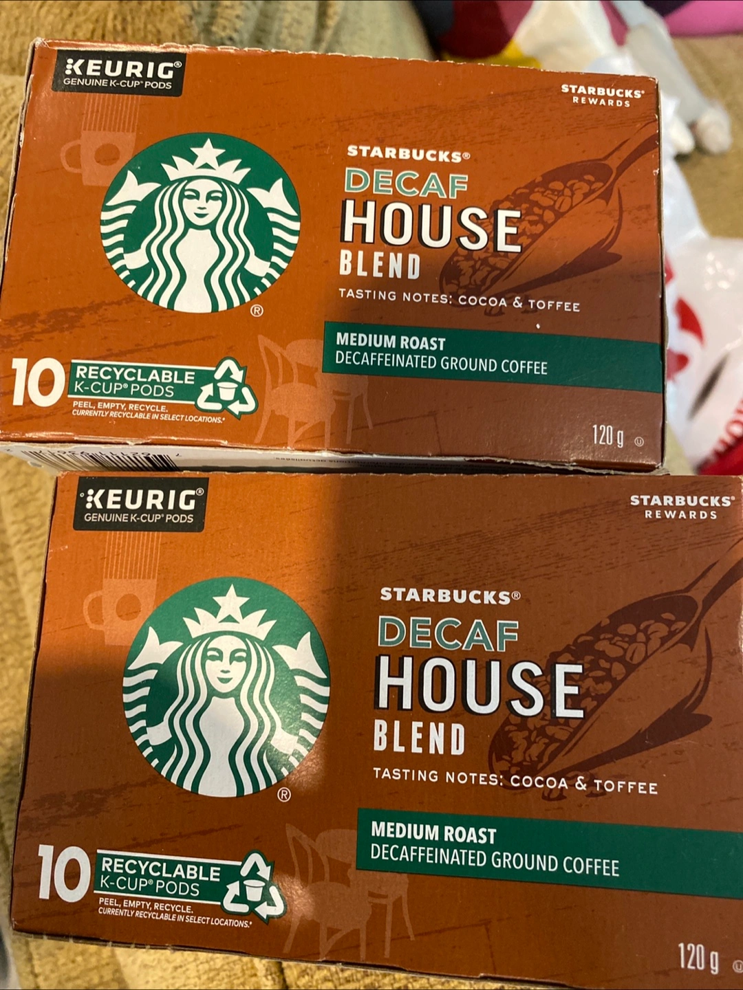 Two boxes of Starbucks Decaf House Blend K-Cups are up for grabs! Each box contains 10 recyclable K-Cup pods, perfect for a medium roast, decaffeinated ground coffee with tasting notes of cocoa and toffee