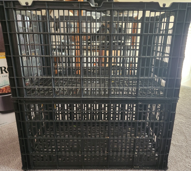 Selling two black plastic storage crates. They're stackable and in good condition, ready to help you organize your space!