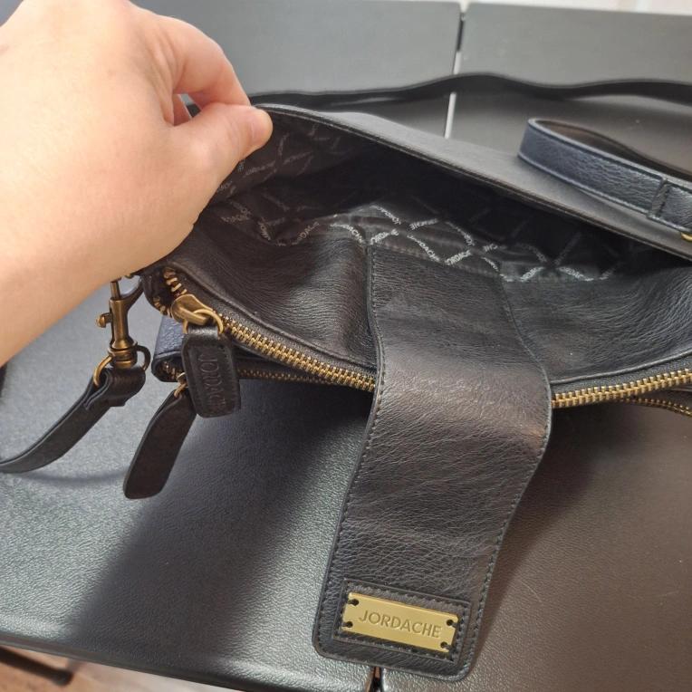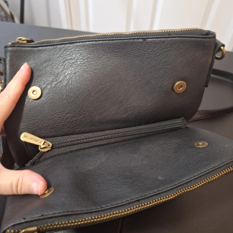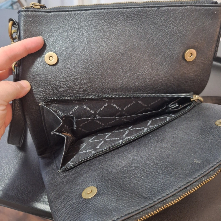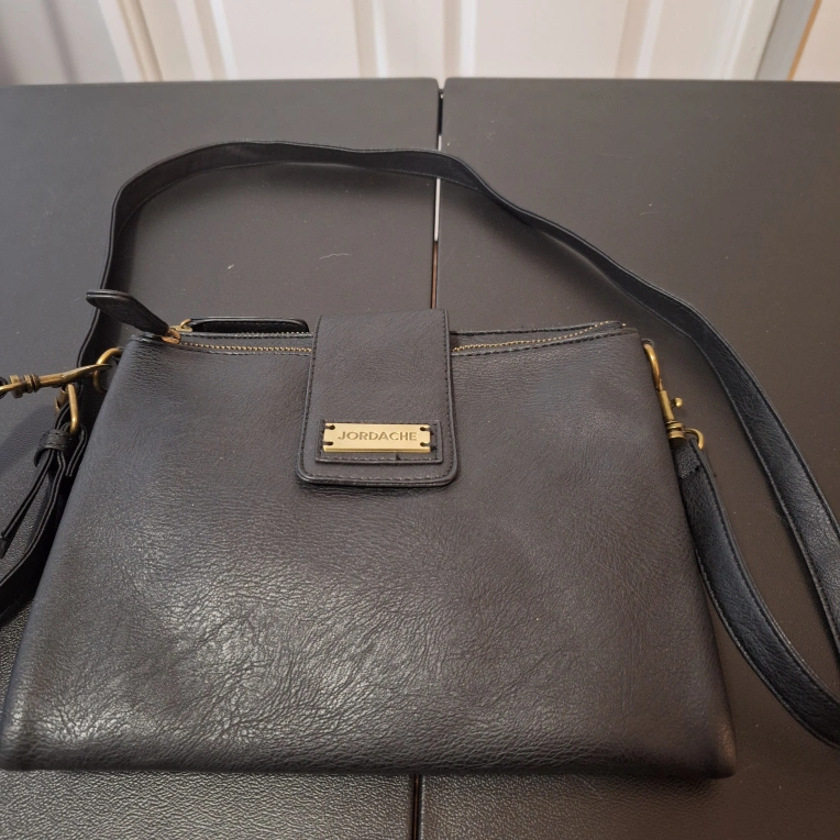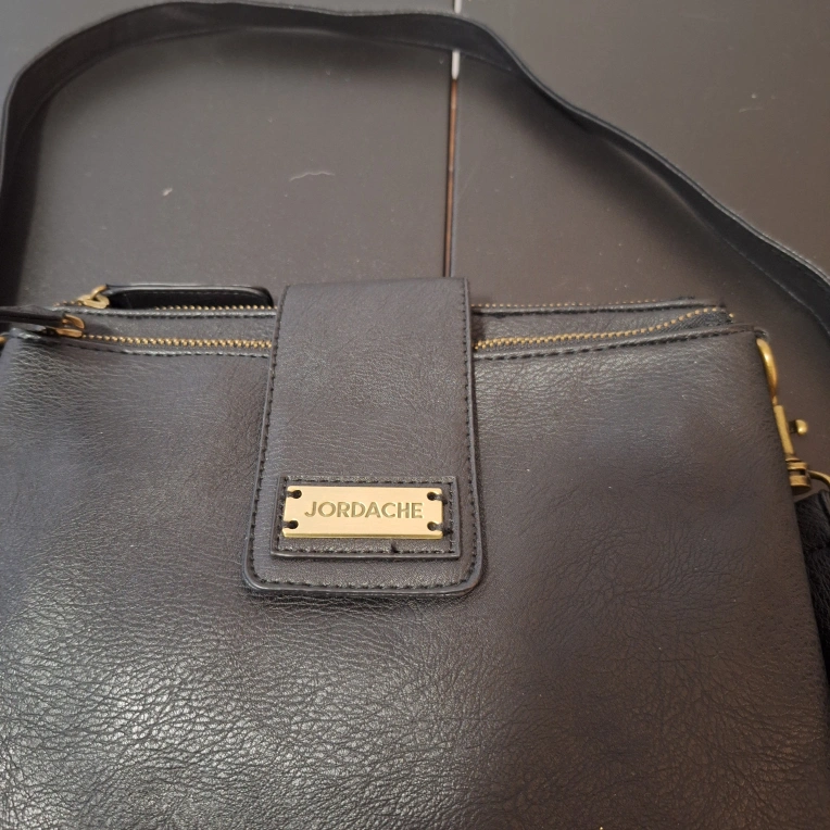 Here's a Jordache black crossbody bag! It features a stylish design and is perfect for carrying your essentials. The bag has a convenient crossbody strap for easy wear. It's in great condition and ready for a new home