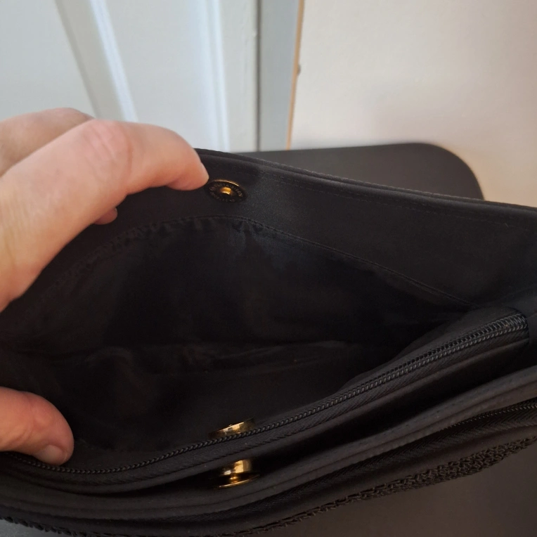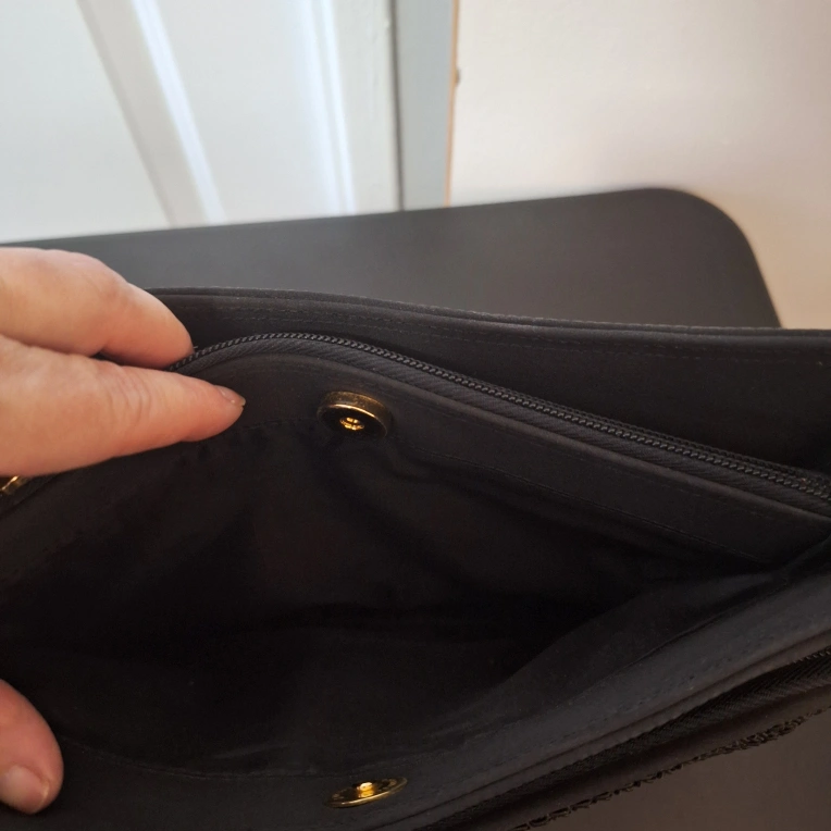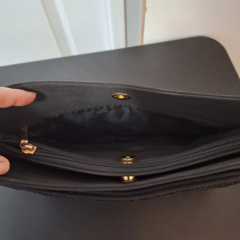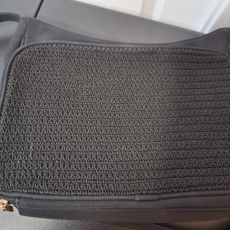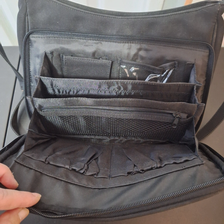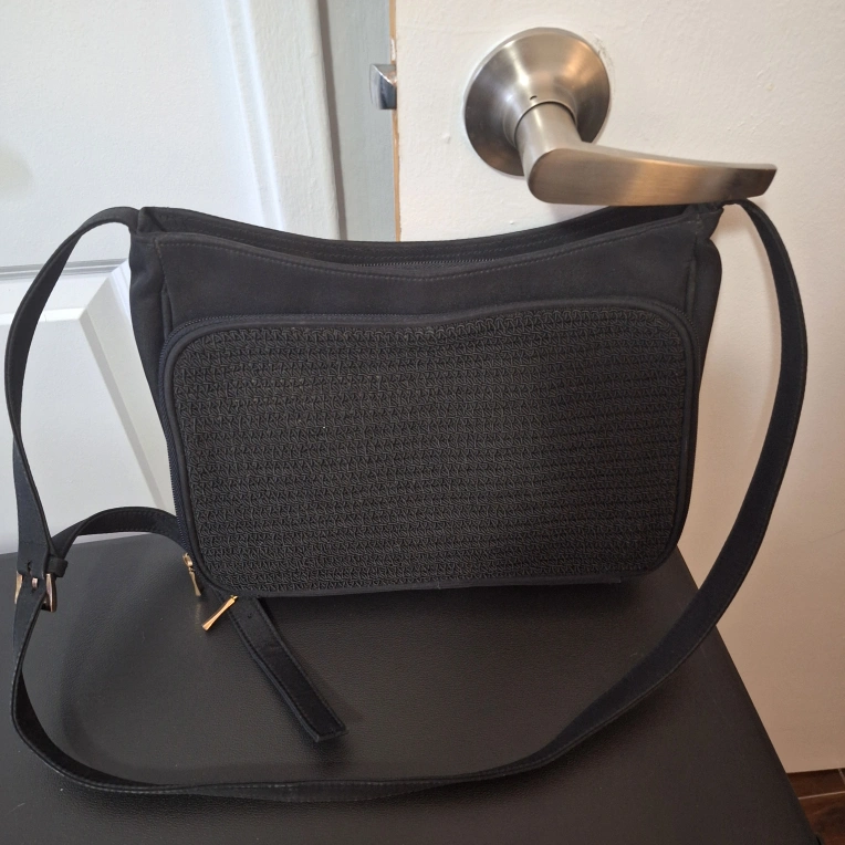 Selling a black shoulder bag. It has a front pocket with a woven design. The inside has multiple compartments and zippered pockets. Great for organizing all your essentials!