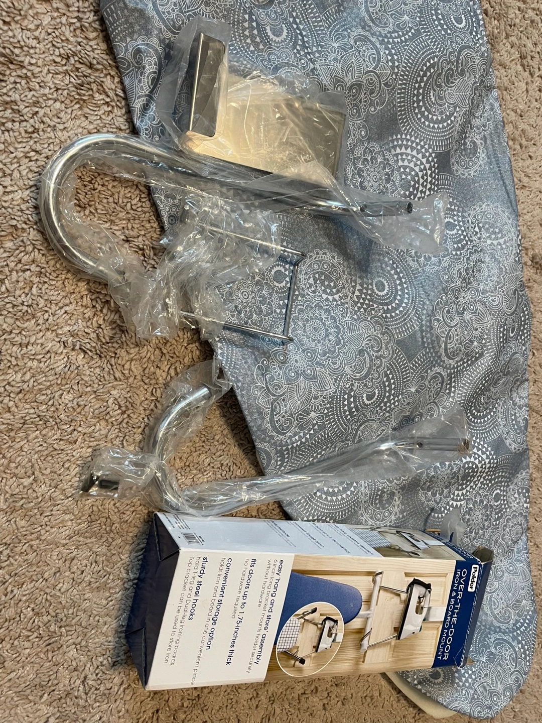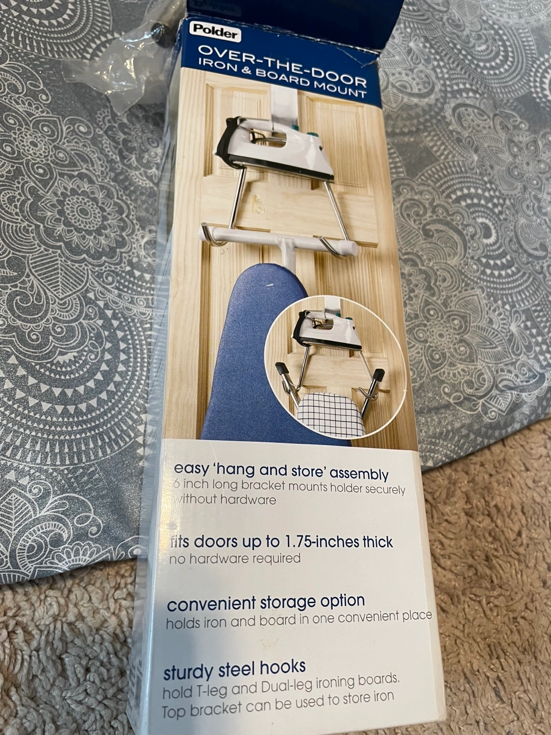 Selling a brand new Polder over-the-door iron cover and ironing board mount! It features sturdy steel hooks and a convenient storage option to hold your iron and board in one place. It's easy to hang and store, and fits doors up to 1.75 inches thick. No hardware is required!