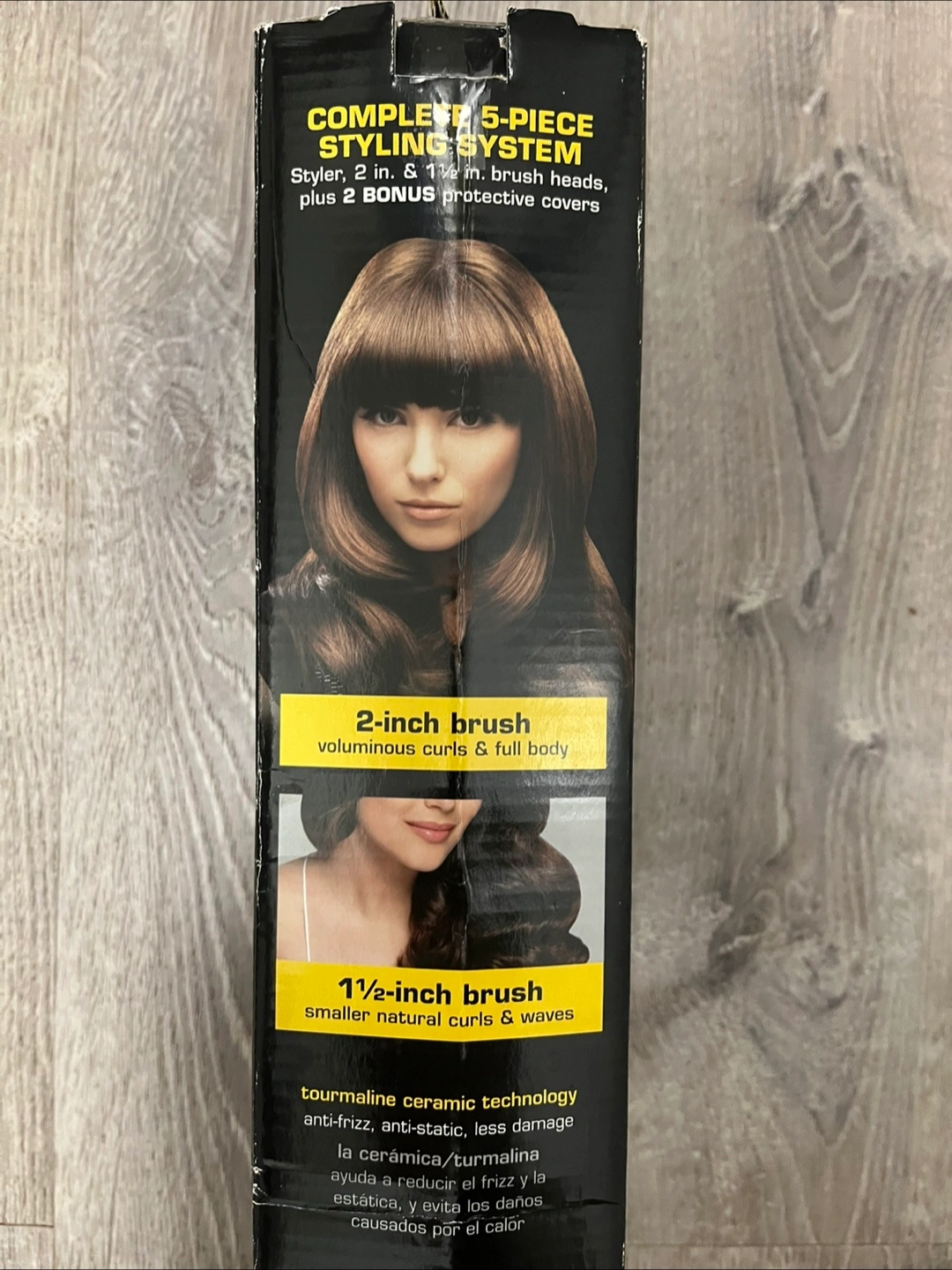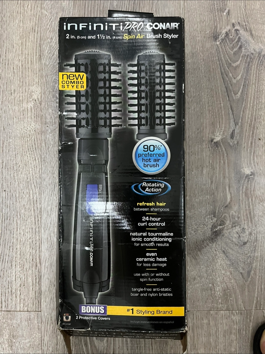 Infiniti Pro Conair 5-Piece Styling System. It includes a styler, 2-inch and 1 1/2-inch brush heads, plus 2 bonus protective covers. It also has rotating action to refresh hair between shampoos and 24-hour curl control. It uses natural tourmaline ionic conditioning for smooth results; ceramic heat for less damage