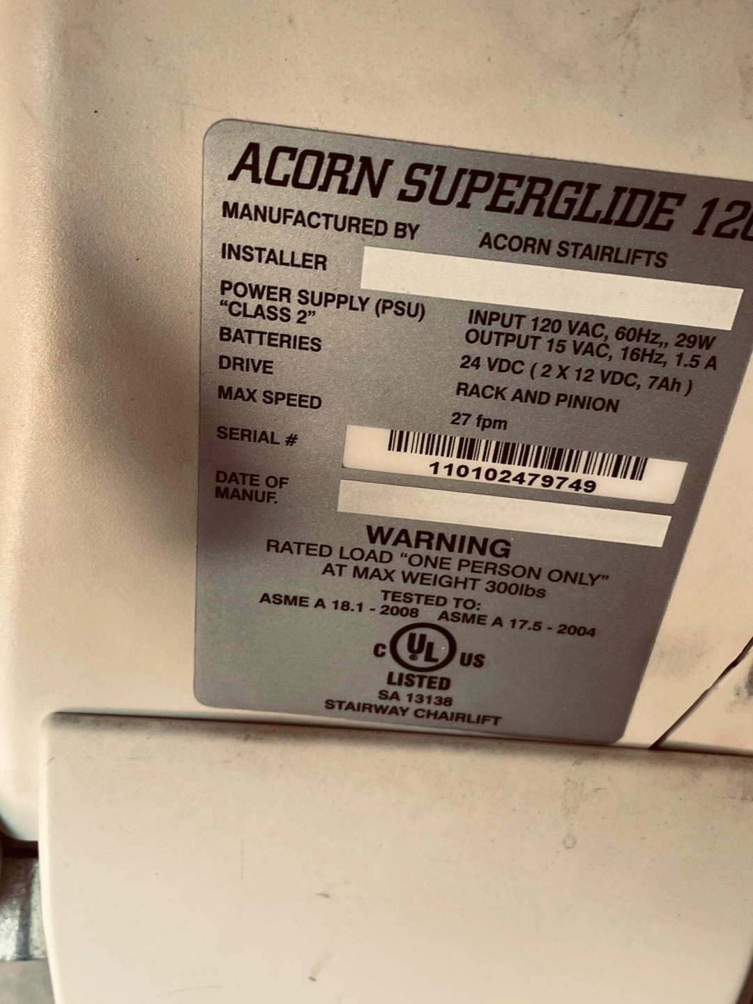 Selling an Acorn Superglide 120 Stairlift. It's designed for one person with a maximum weight of 300lbs. The manufacturing date is 2011 October 24. It's never used 600$ or OBO