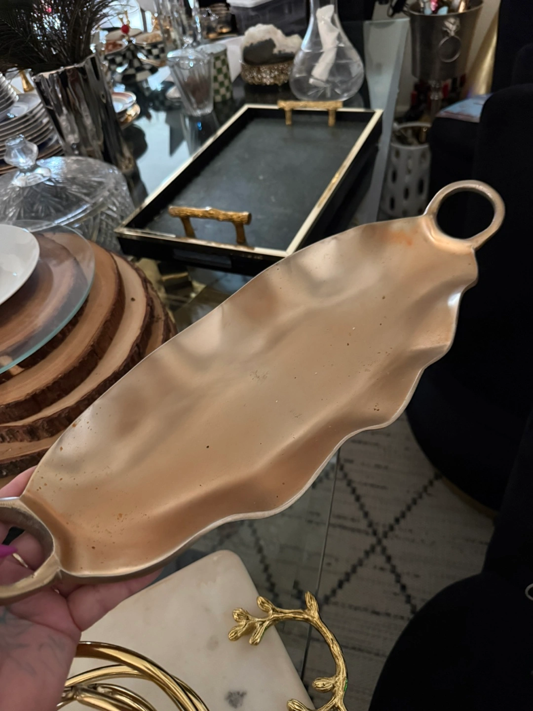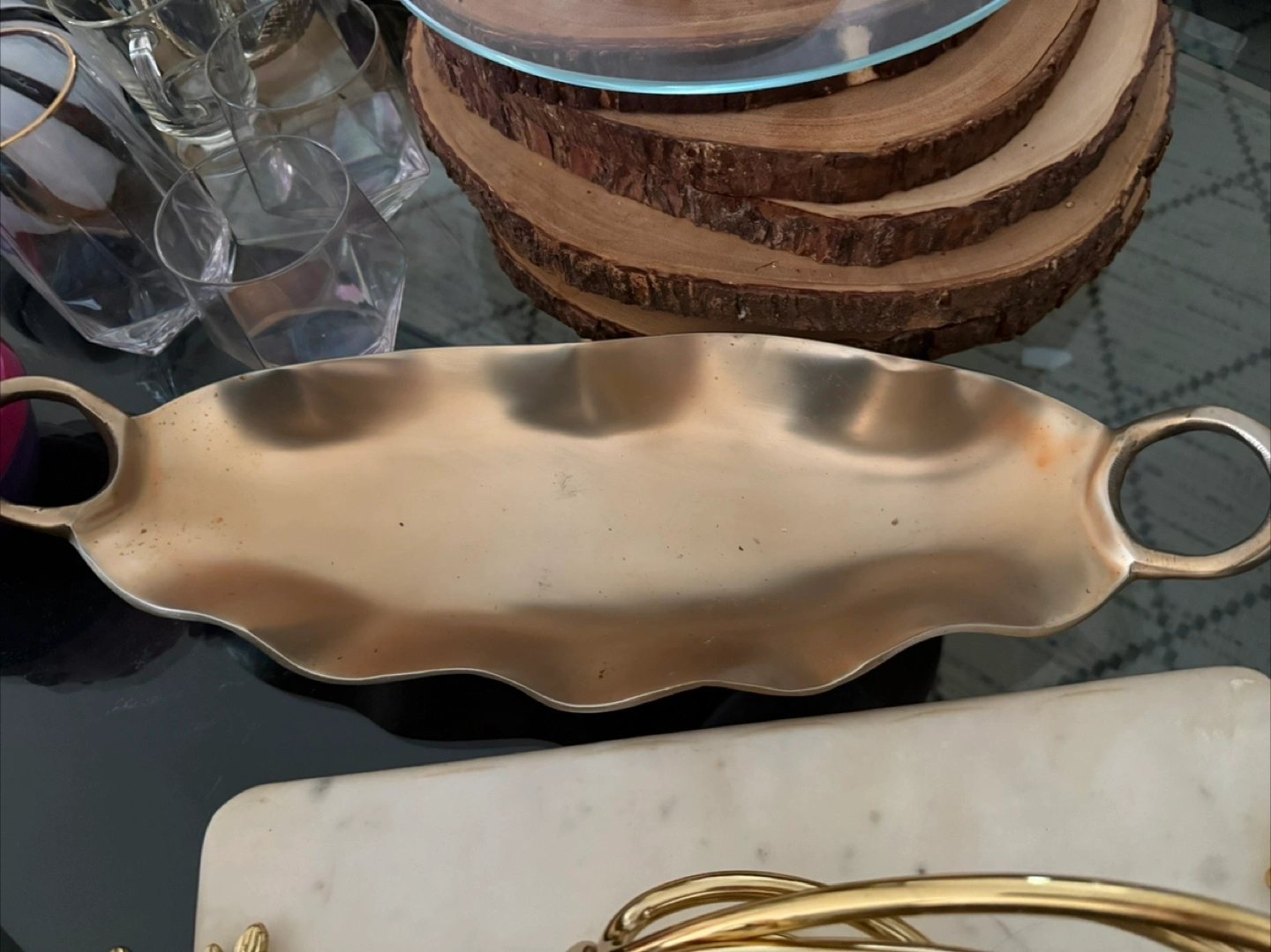 Selling a decorative gold metal tray! It's perfect for adding a touch of elegance to your home decor. It has a unique wavy design and handles on each side, making it easy to carry. It’s in great condition and ready to find a new home