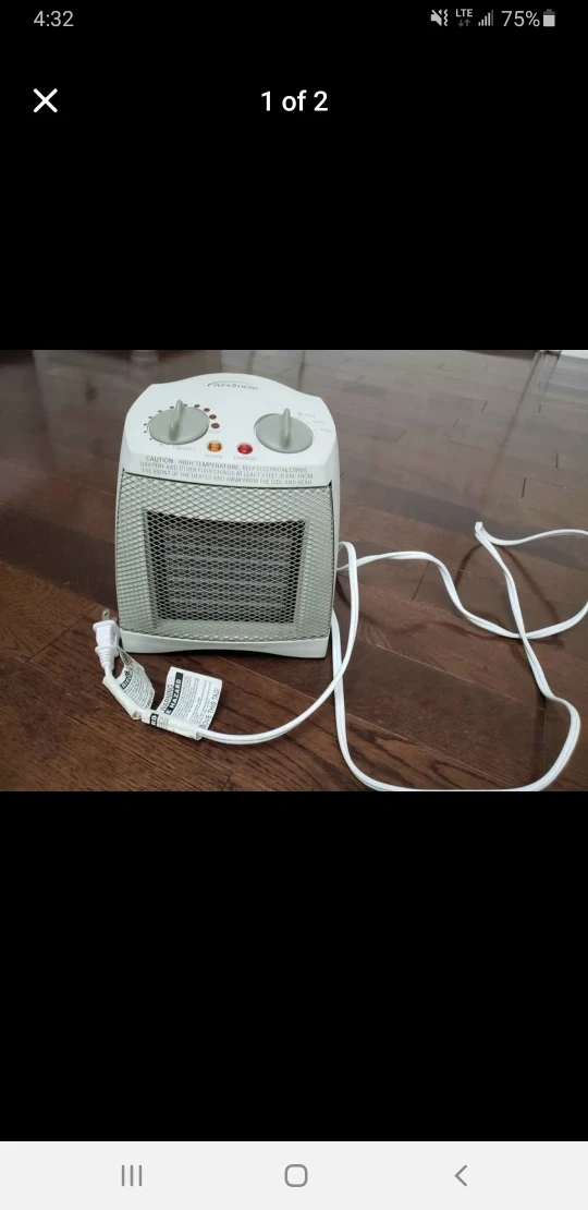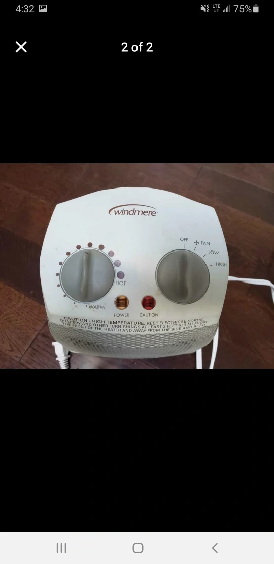 Selling a Windmere portable space heater. It has settings for off, fan, low, and high. It also has warm and hot settings. Perfect for keeping a small space cozy!