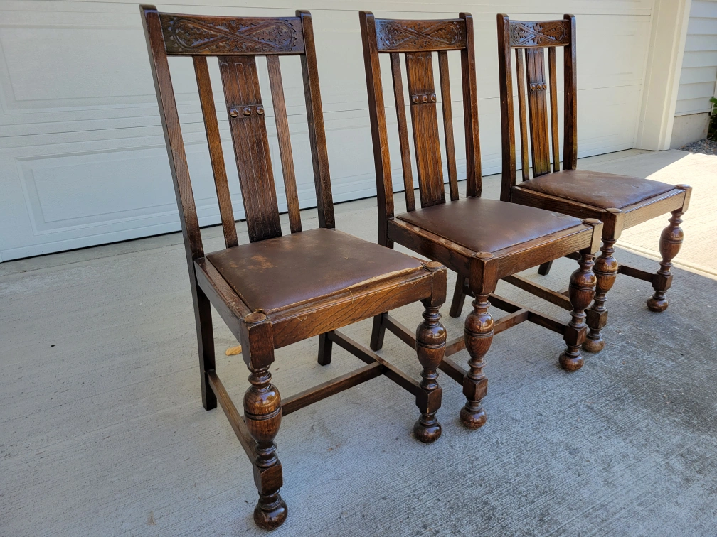 Selling a set of three antique oak dining chairs. They have a unique carved design and a classic look. The chairs have leather seats. They show signs of wear and tear, particularly on the seats, but they're still sturdy and full of character! $15 Each. Let me know if you are interested. Thanks.