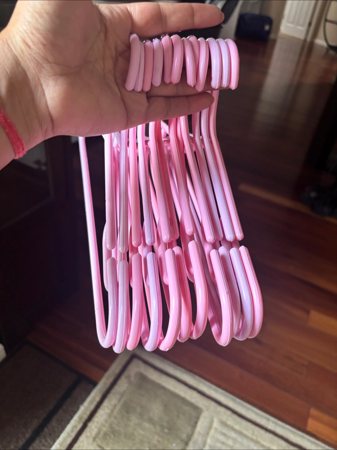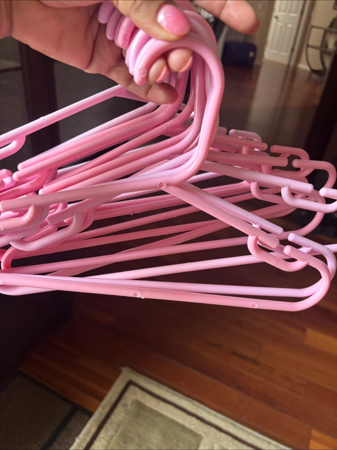 44set of 12 pink plastic clothes hangers. They're perfect for organizing little girls closets They are in great condition.