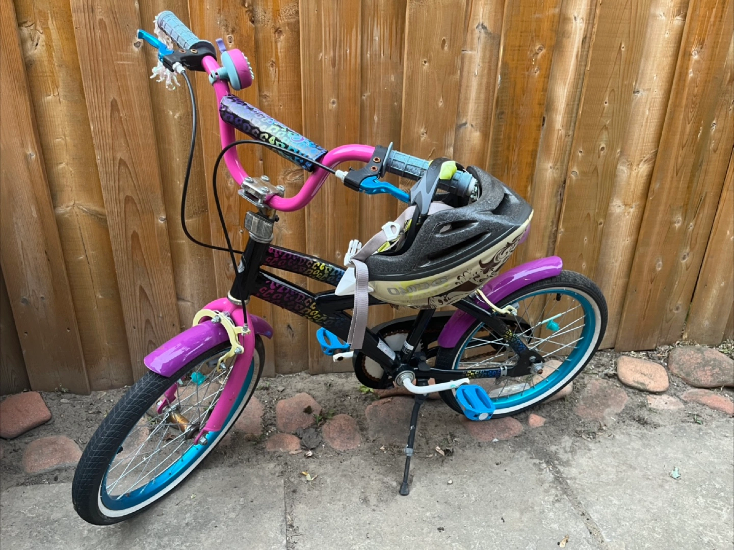 Selling a cute kids' bike in purple, pink, and blue! It's in good condition and ready for a new rider. Perfect for learning to ride or cruising around the neighbourhood