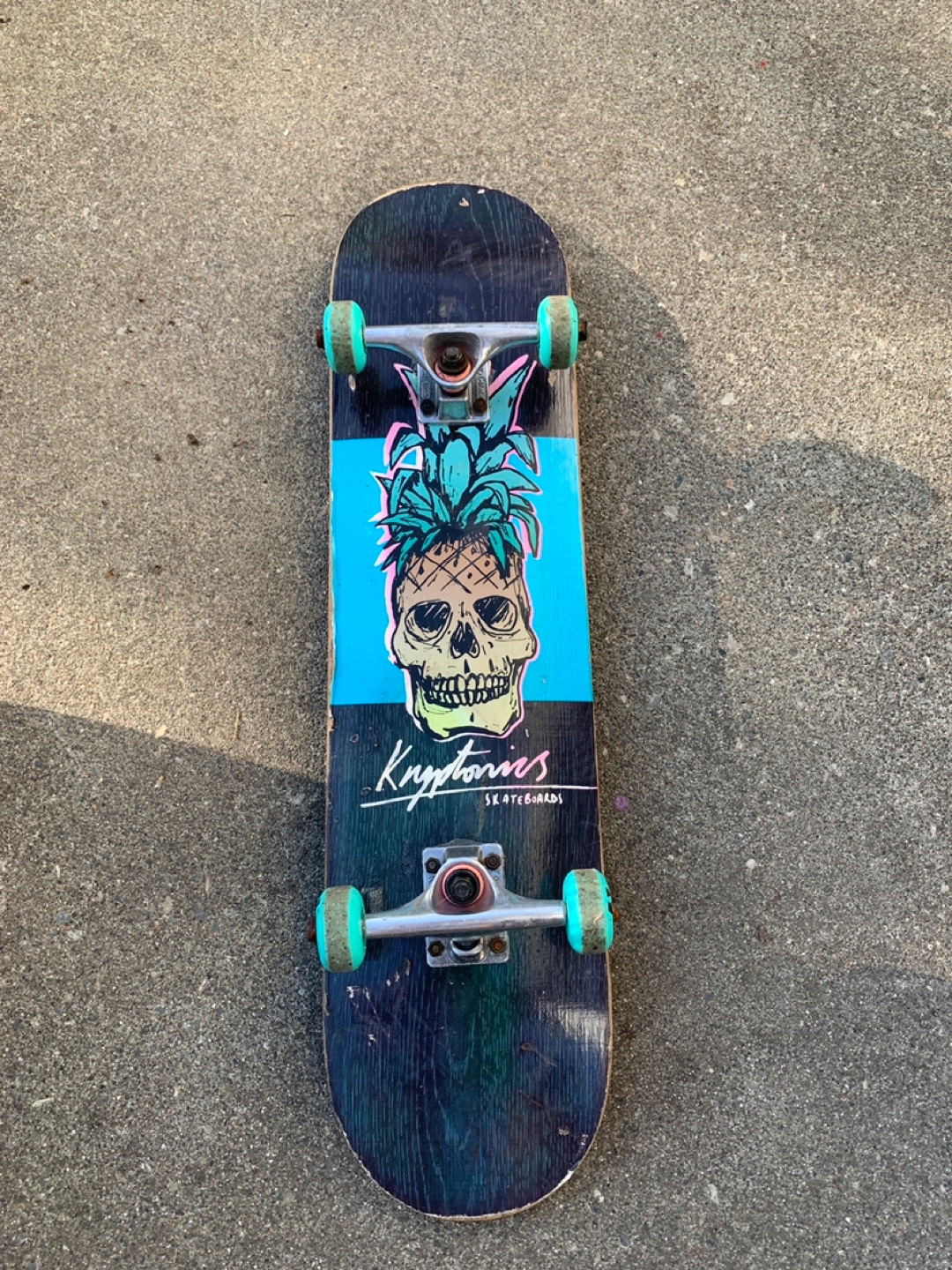 Selling a used Kryptonics skateboard. It has a cool pineapple skull design on the deck. The wheels are a nice light blue colour. It's ready to ride!