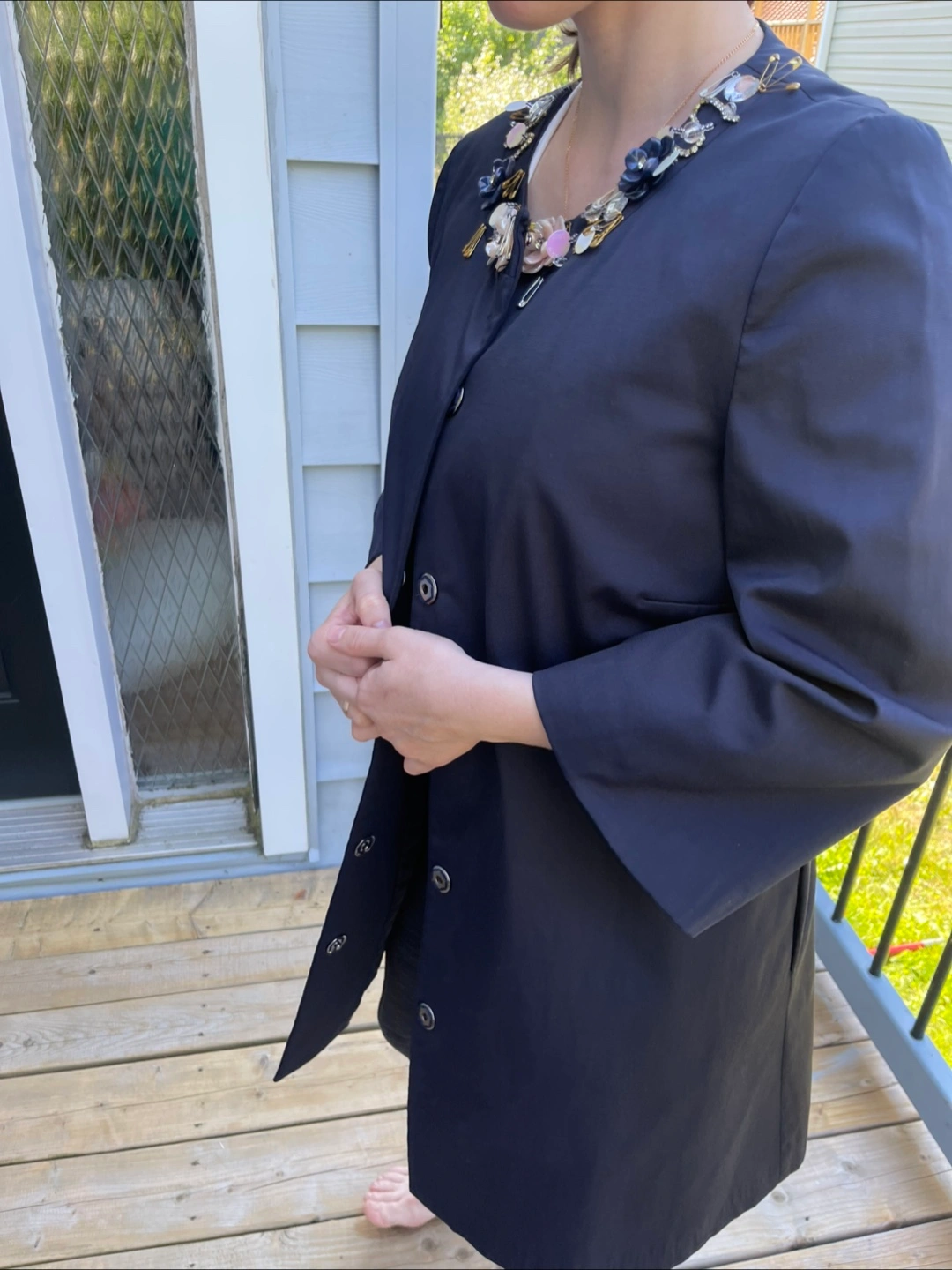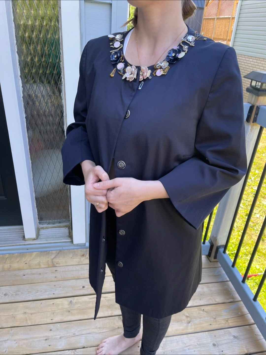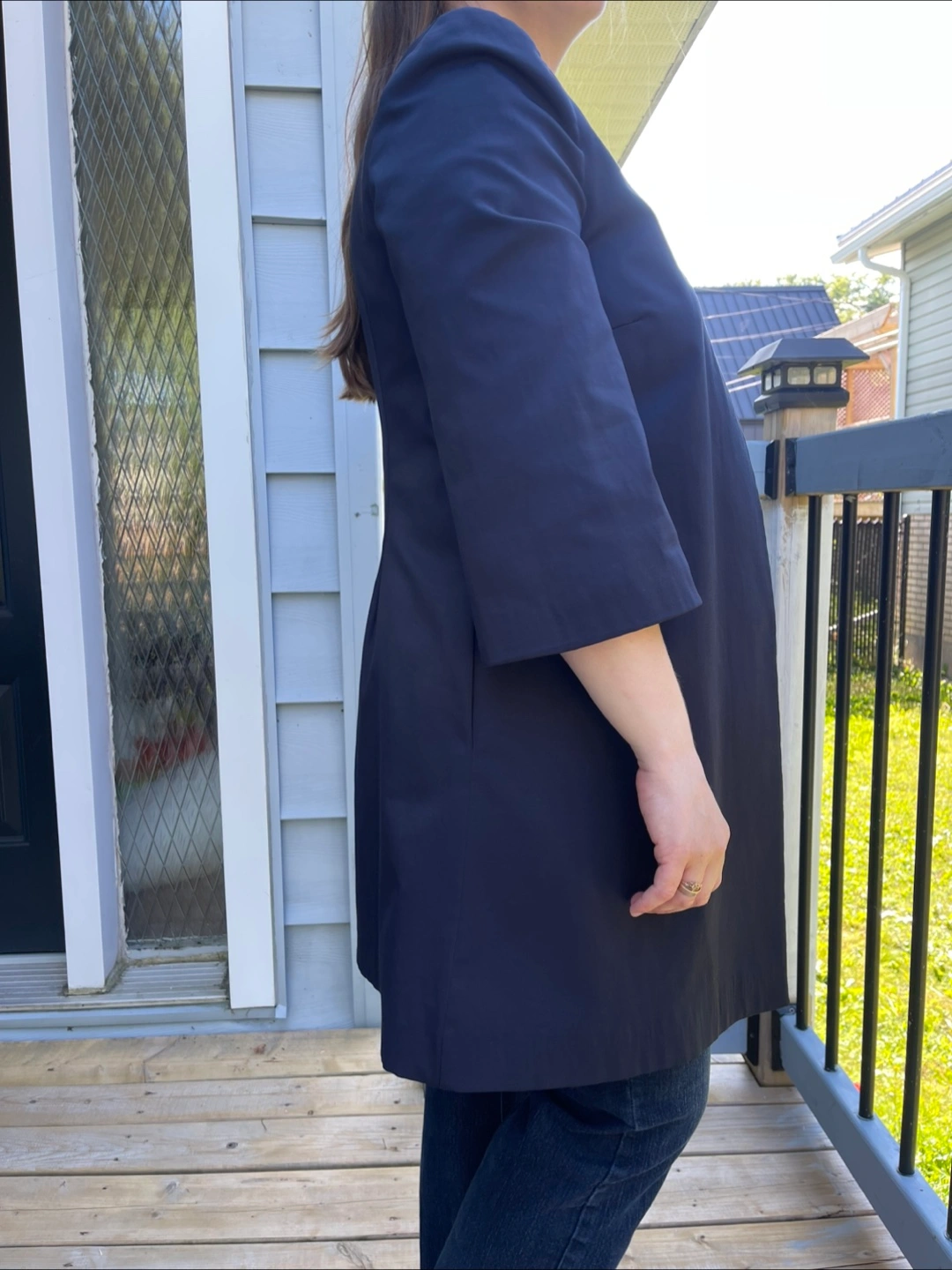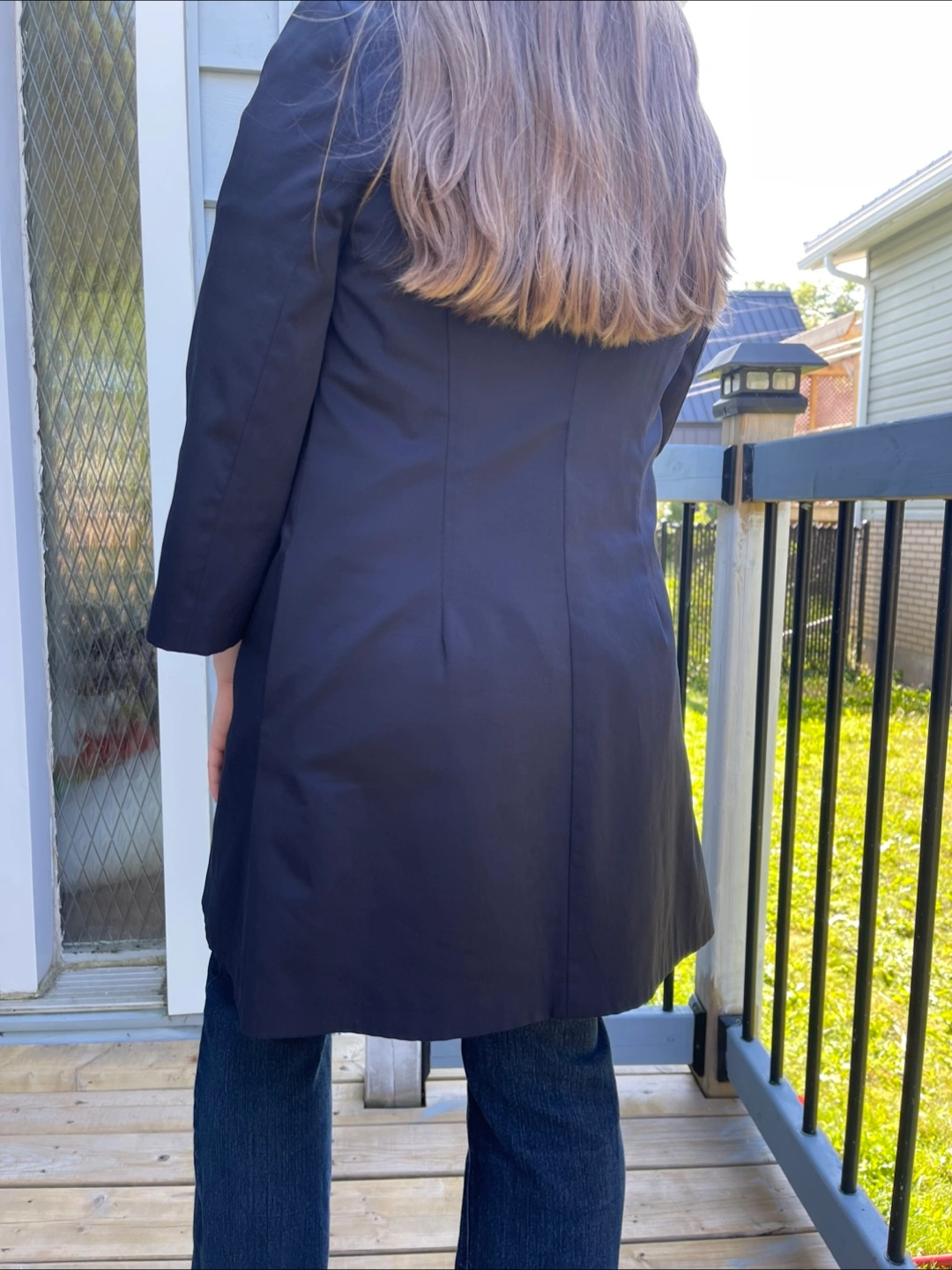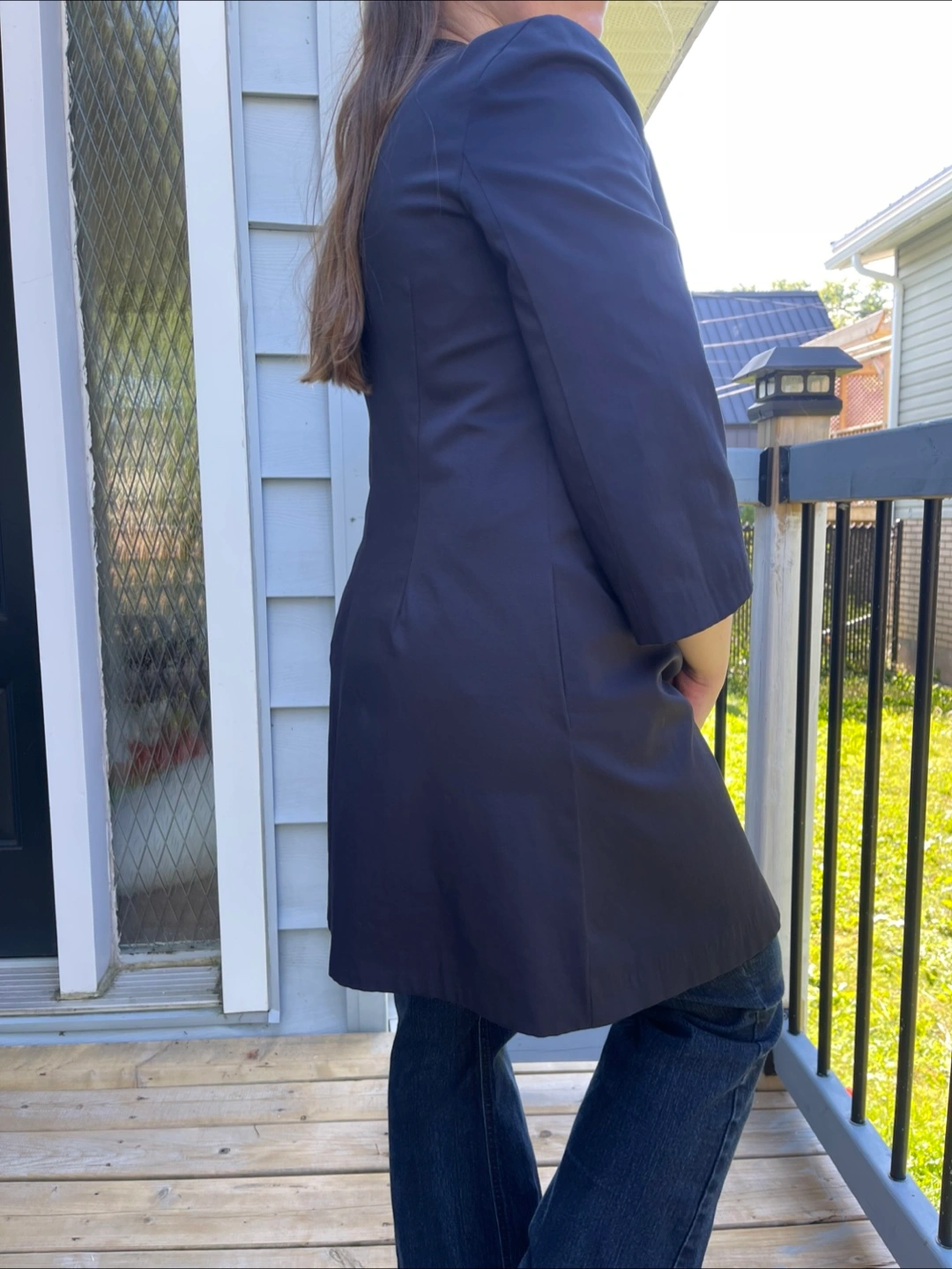 Selling a navy blue dress coat. It's in great condition and ready for a new home! It's a stylish piece that can be dressed up or down, perfect for adding a touch of elegance to any outfit Size - M