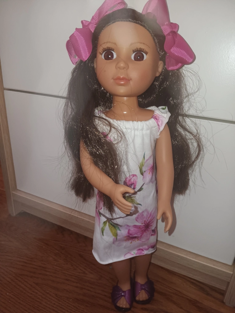 This is a 14-inch doll that comes with several cute outfits and accessories! She has brown hair and eyes and is ready for a new home. Perfect for kids who love playing dress-up and creating stories. Sandals, blue sparkling sneakers, suitcase with brush and scissors, ribbons included. $30 for lot - firm