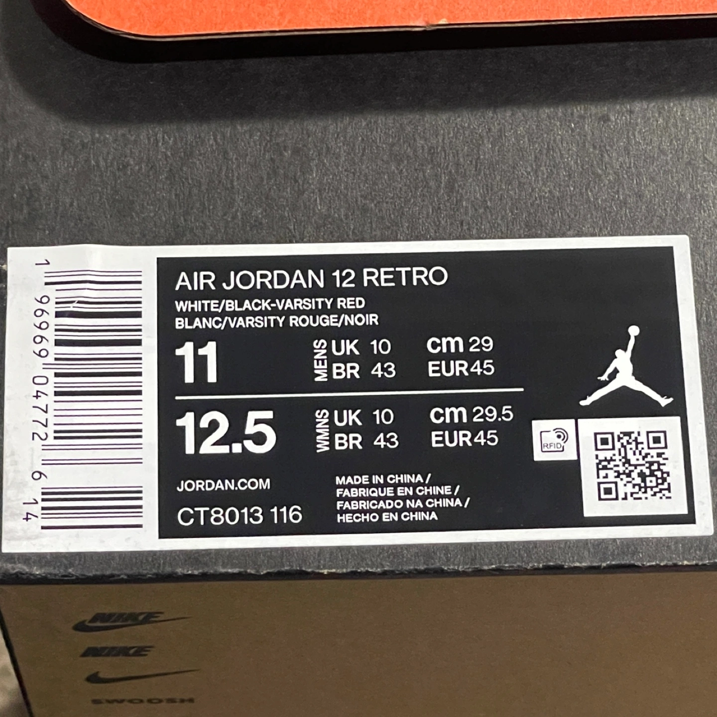 35Selling a pair of Air Jordan 12 Retro sneakers in white, black, and varsity red. They are a US size 11 and come in the original box. The iconic design and comfortable fit make these a great addition to any sneaker collection. No insoles