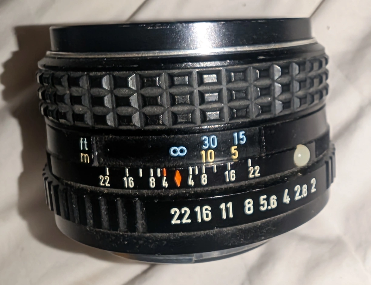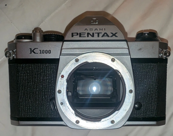 Selling a Pentax K1000 film camera with an SMC Pentax 1:2 55mm lens. It's in good condition and ready for your film photography adventures! The lens has markings for focusing distance and aperture settings. Asking $225 OBO