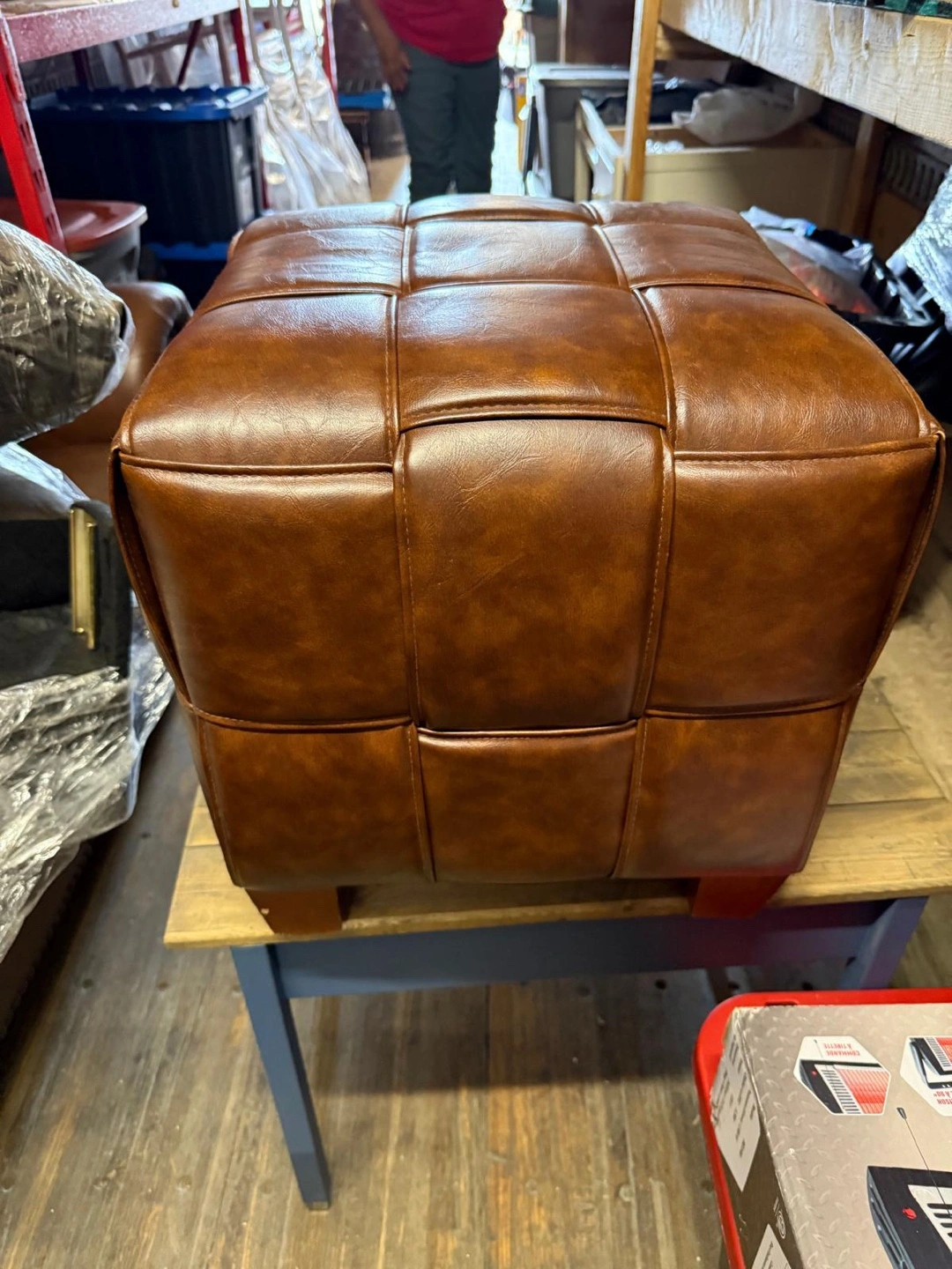 Selling a lovely brown woven faux leather ottoman! It's in great shape and measures approximately 17 inches in height and width. It would be a great addition to any living room or bedroom as a footrest or extra seating