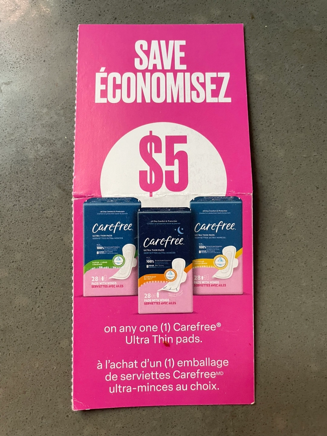 Have a coupon for $5 off any one Carefree Ultra Thin pads! Expires December 30, 2025, so you have lots of time to use it :)