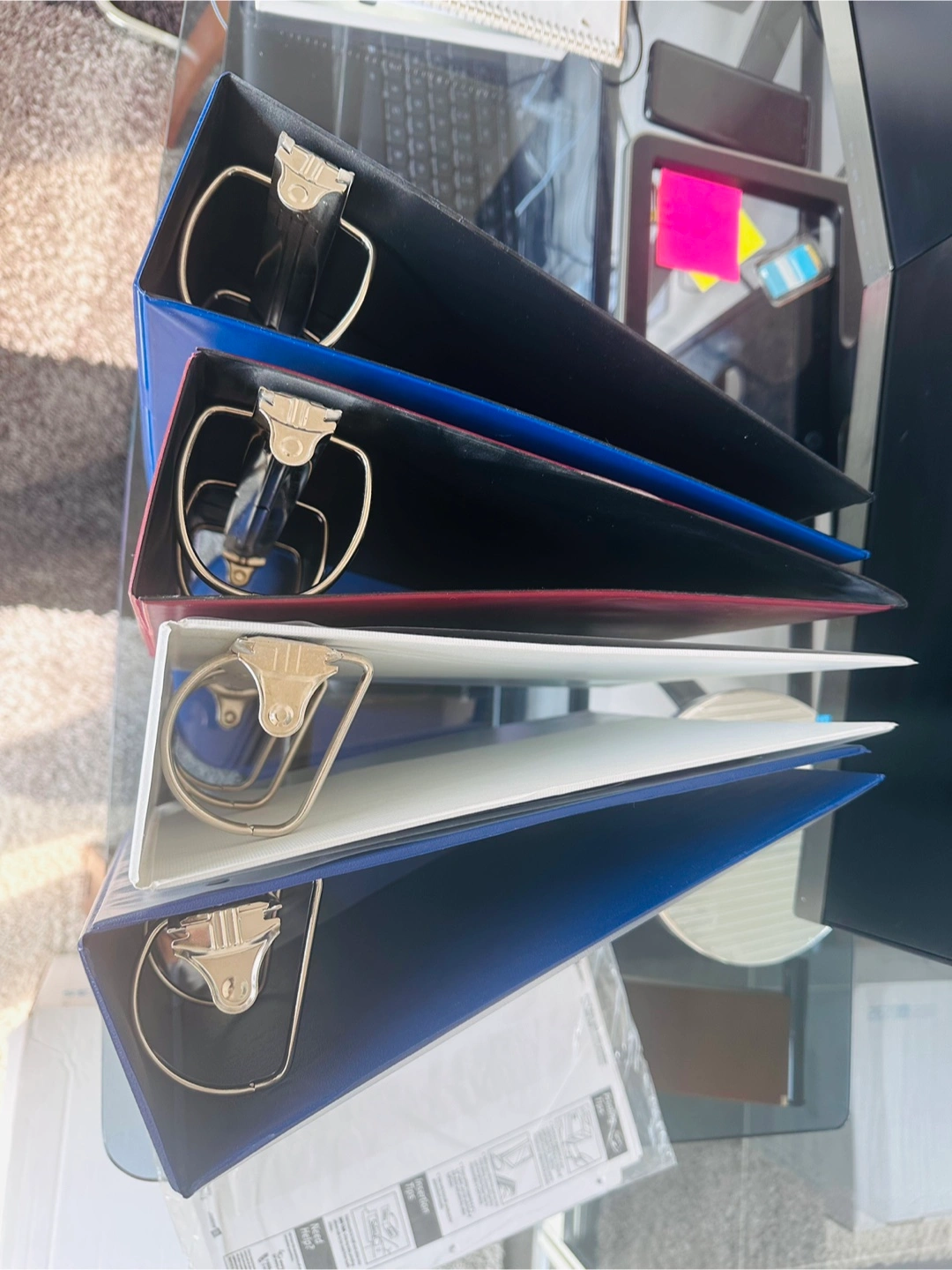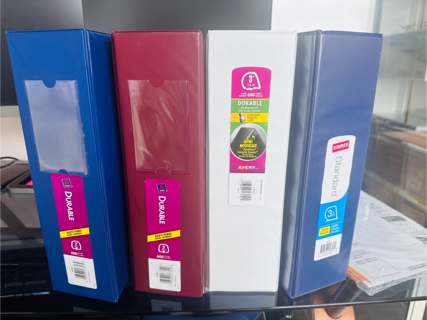 Giving away a set of four 3-inch binders! There's one Staples brand binder and three Avery brand binders. They are durable and easy to use and each can hold up to 600 sheets of paper. Great for keeping your documents organized!