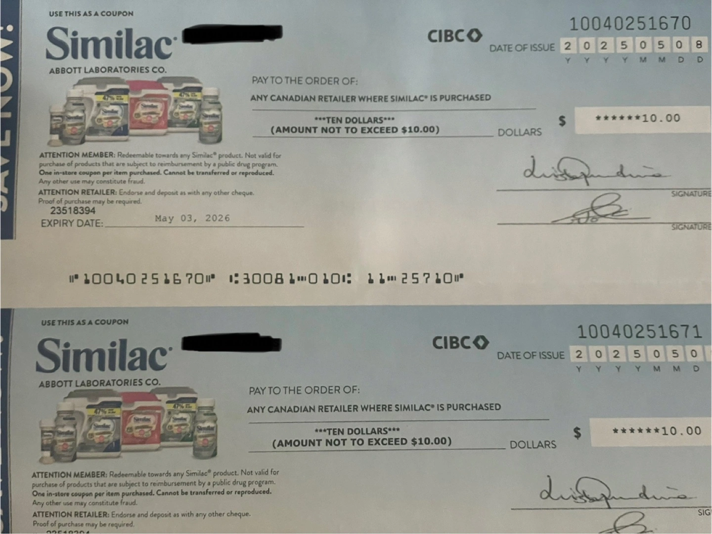 I have two Similac coupons, each worth $10! They can be used at any Canadian retailer where Similac products are sold.